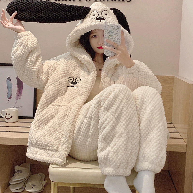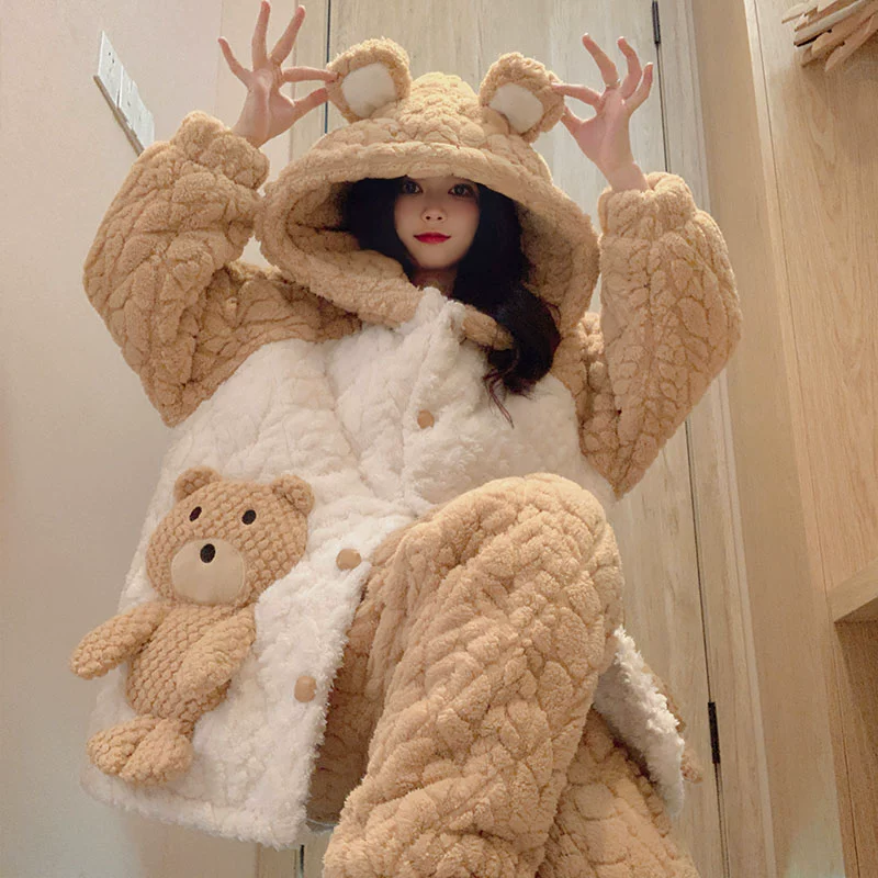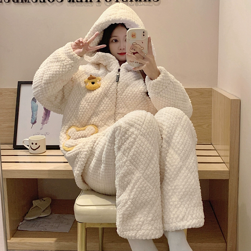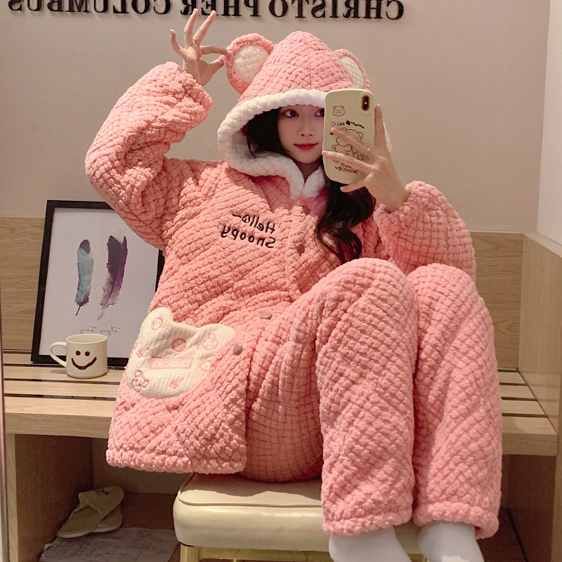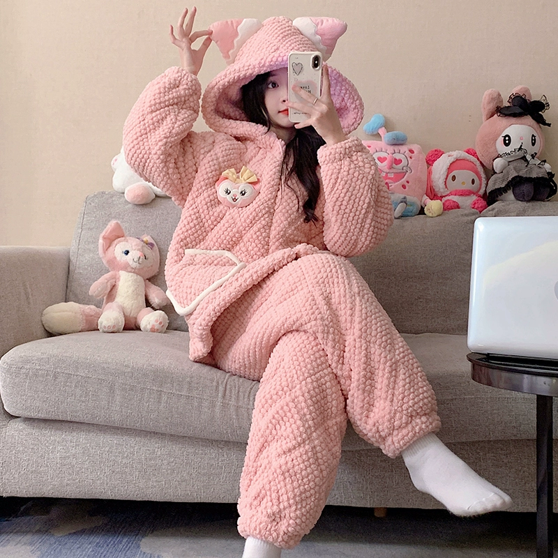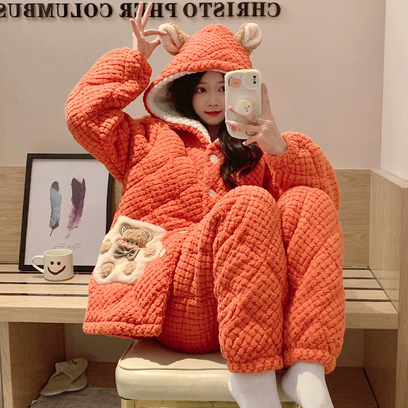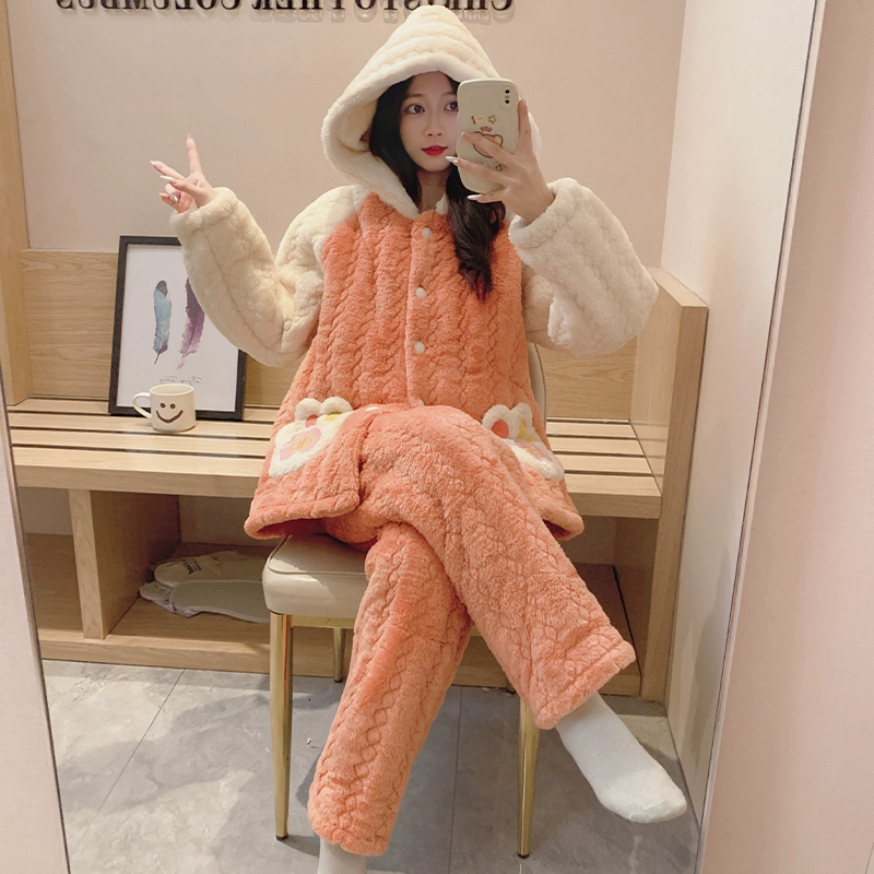 | nameOriginal | Coral velvet pajamas for women autumn and winter three-layer quilted thickened plus velvet warm hooded flannel homewear set |