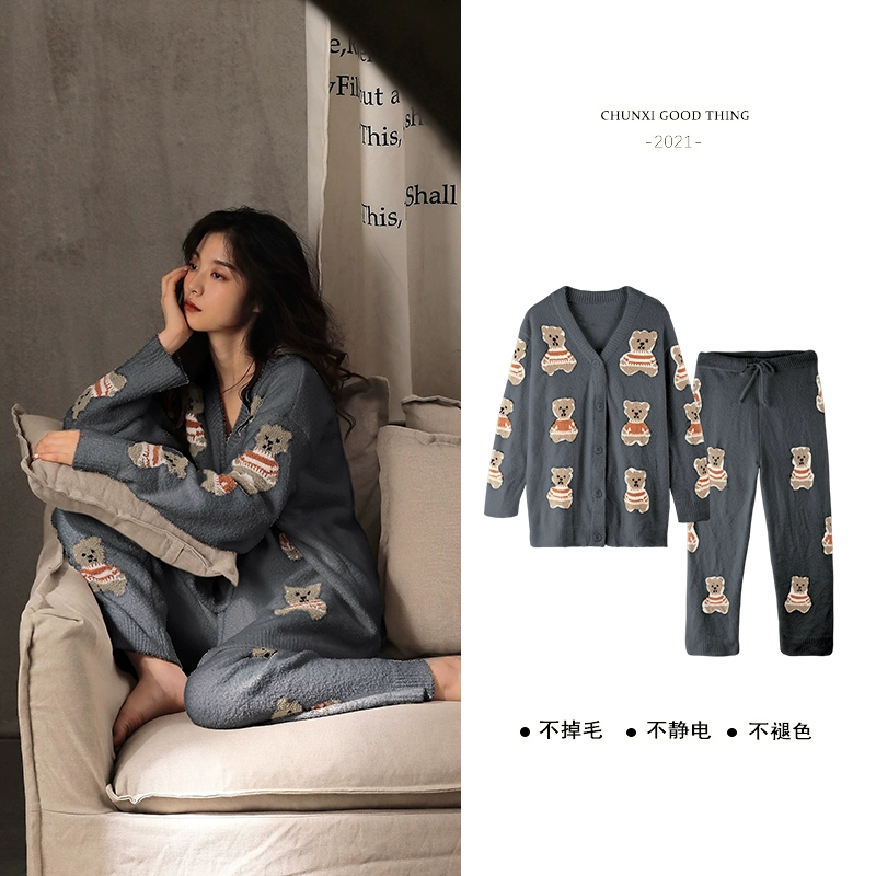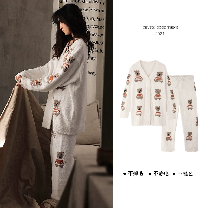 Coral velvet pajamas for women cartoon cute biscuit bear print thickened plus velvet 2021 new V-neck home wear