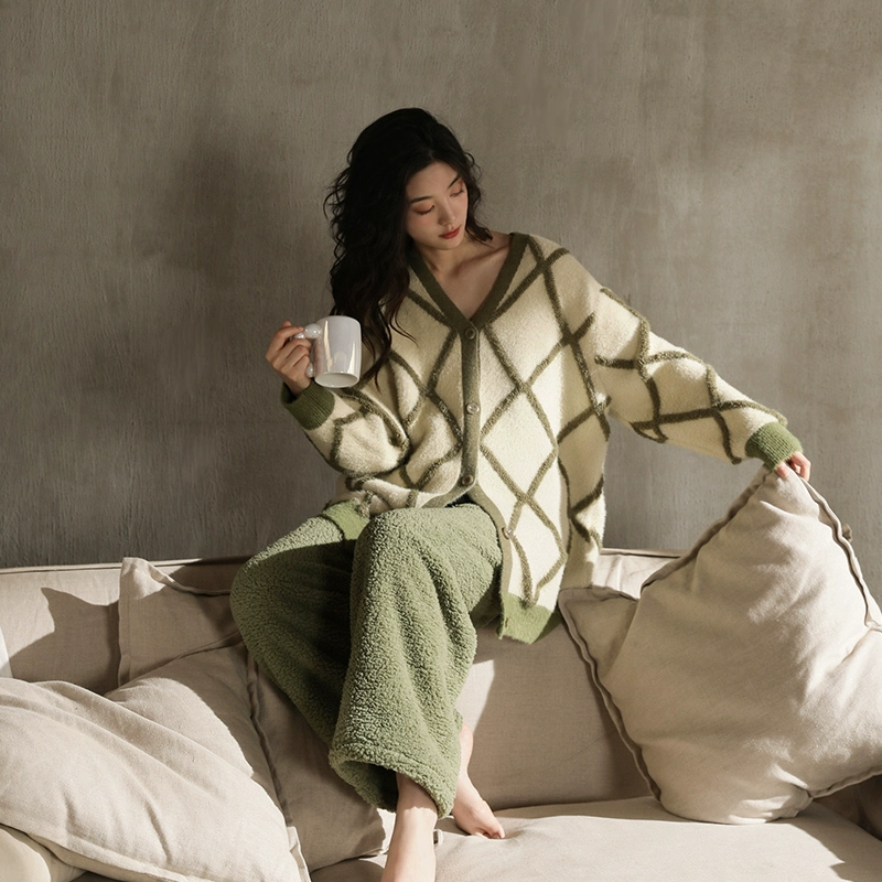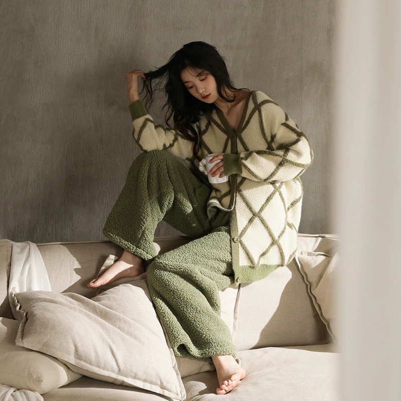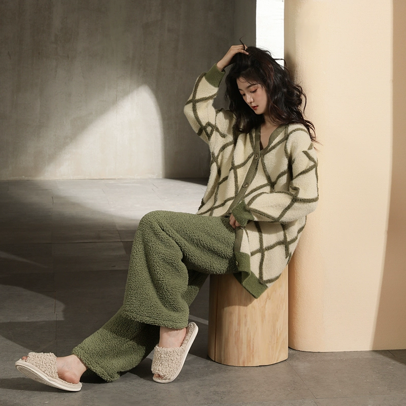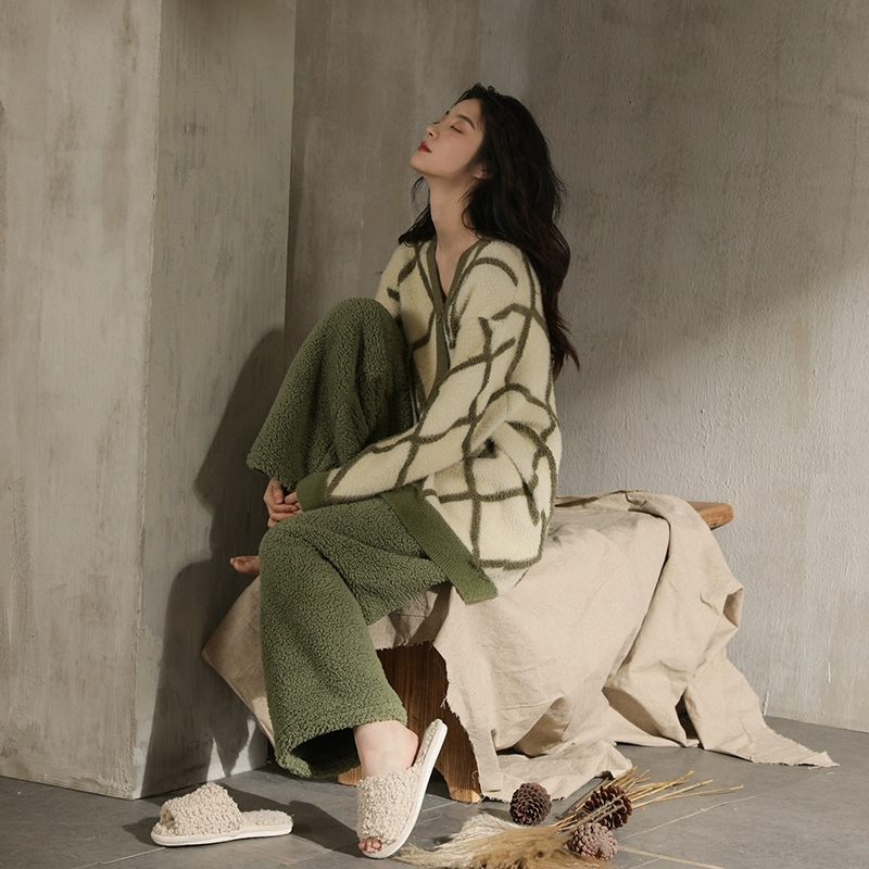 | nameOriginal | Coral velvet pajamas for women winter 2024 new velvet thickened matcha green plaid can be worn outside home clothes set |