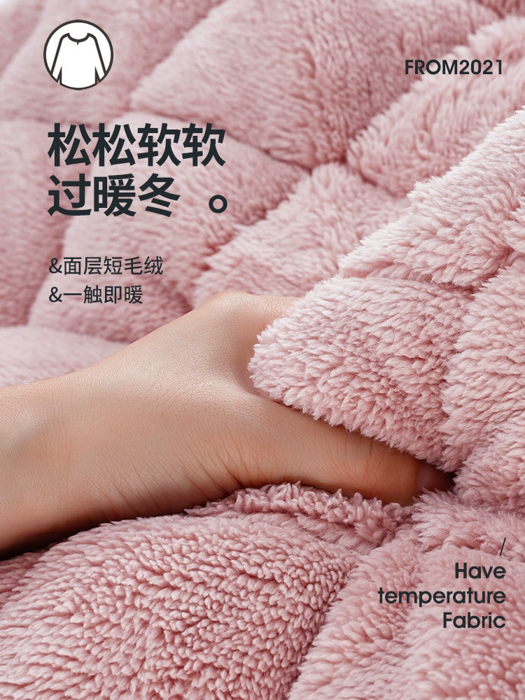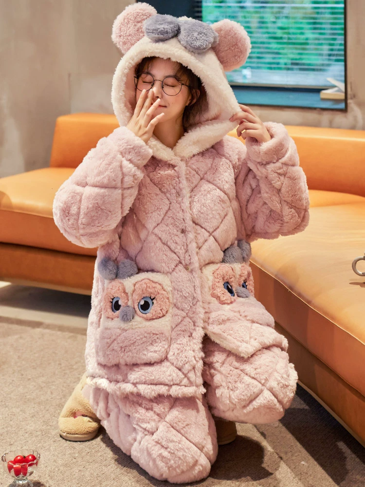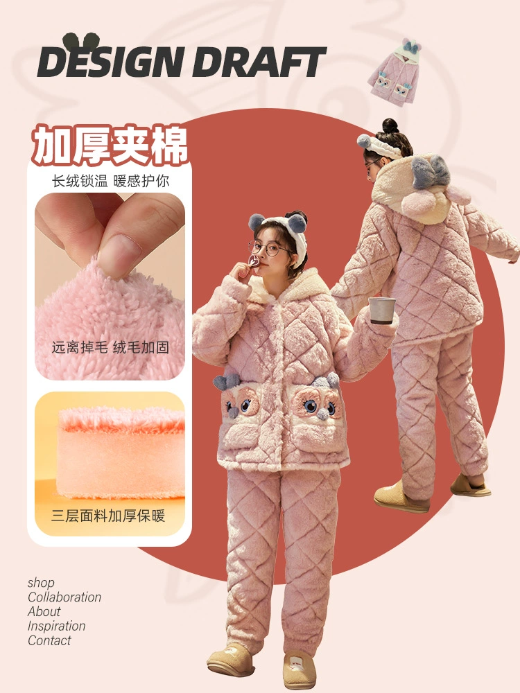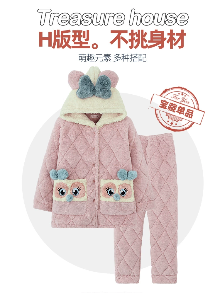 Coral velvet pajamas for women winter plus velvet thickened three-layer quilted hooded warm flannel loose home wear set