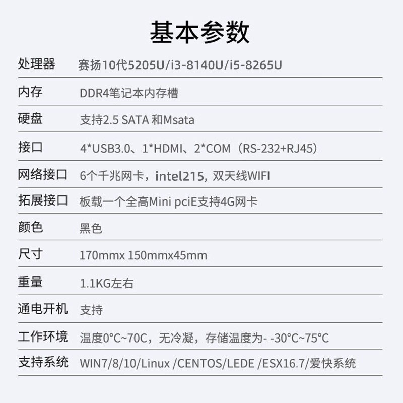 | nameOriginal | Core Shengmei I5-8265U fanless mini host soft routing micro industrial computer micro six gigabit network port |