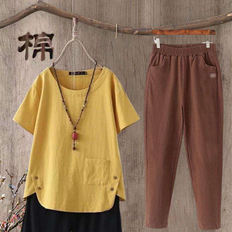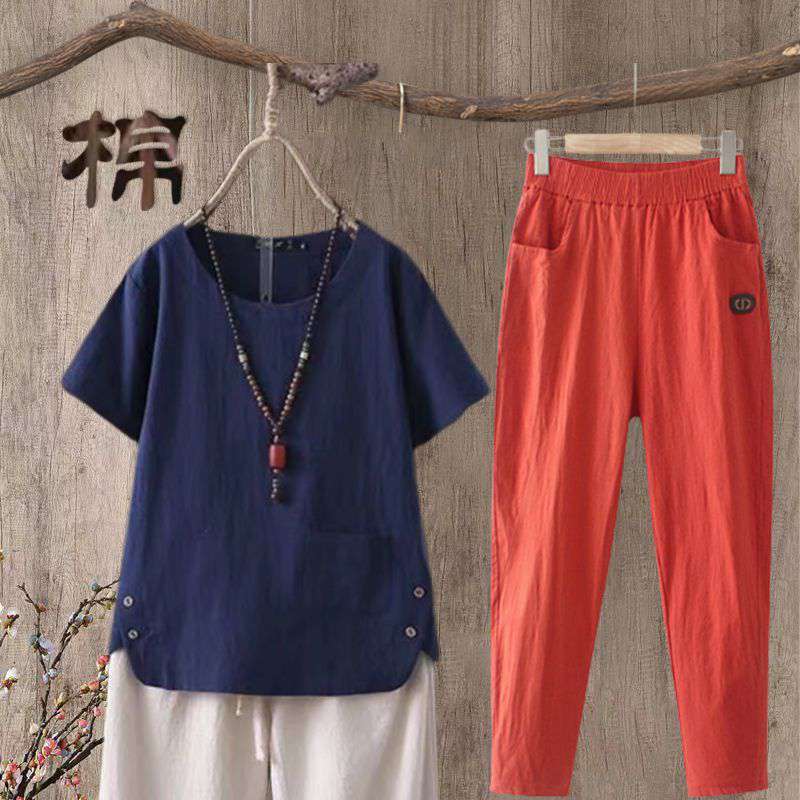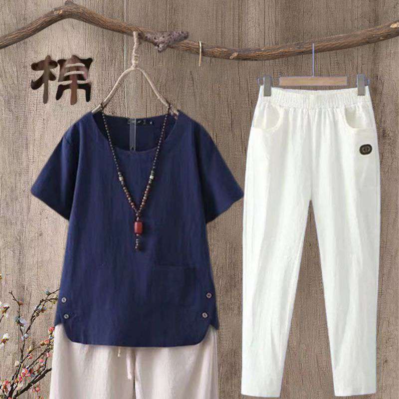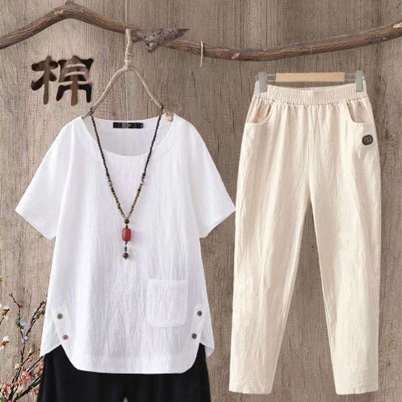 | nameOriginal | Cotton and Linen Ankle-length Pants Set Women's Summer New Large Size Casual Artistic Retro Cotton and Linen Short-sleeved Top |