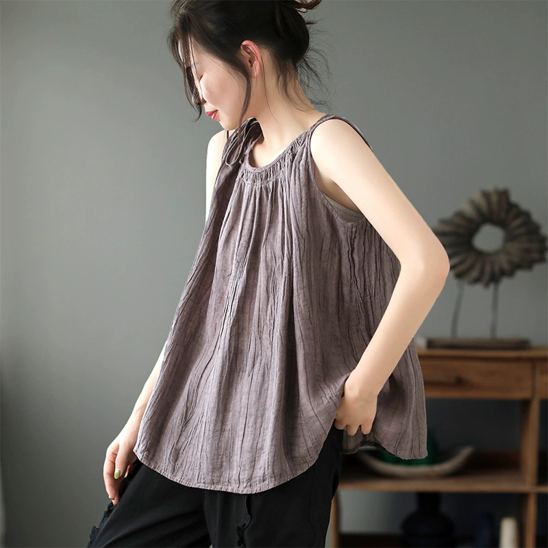 Cotton and linen camisole women's outer wear 2023 summer new high-end pleated top women's literary retro linen T-shirt