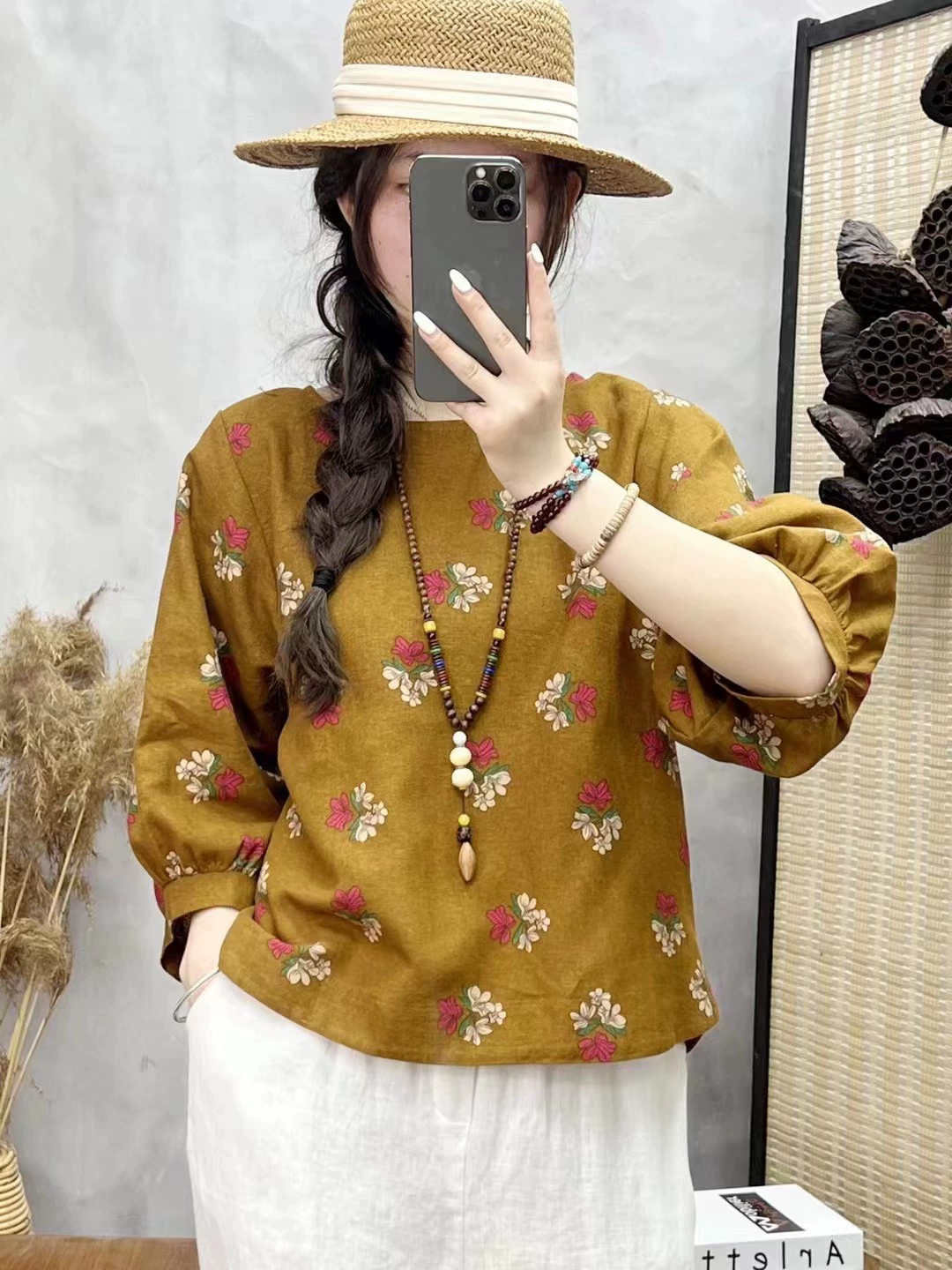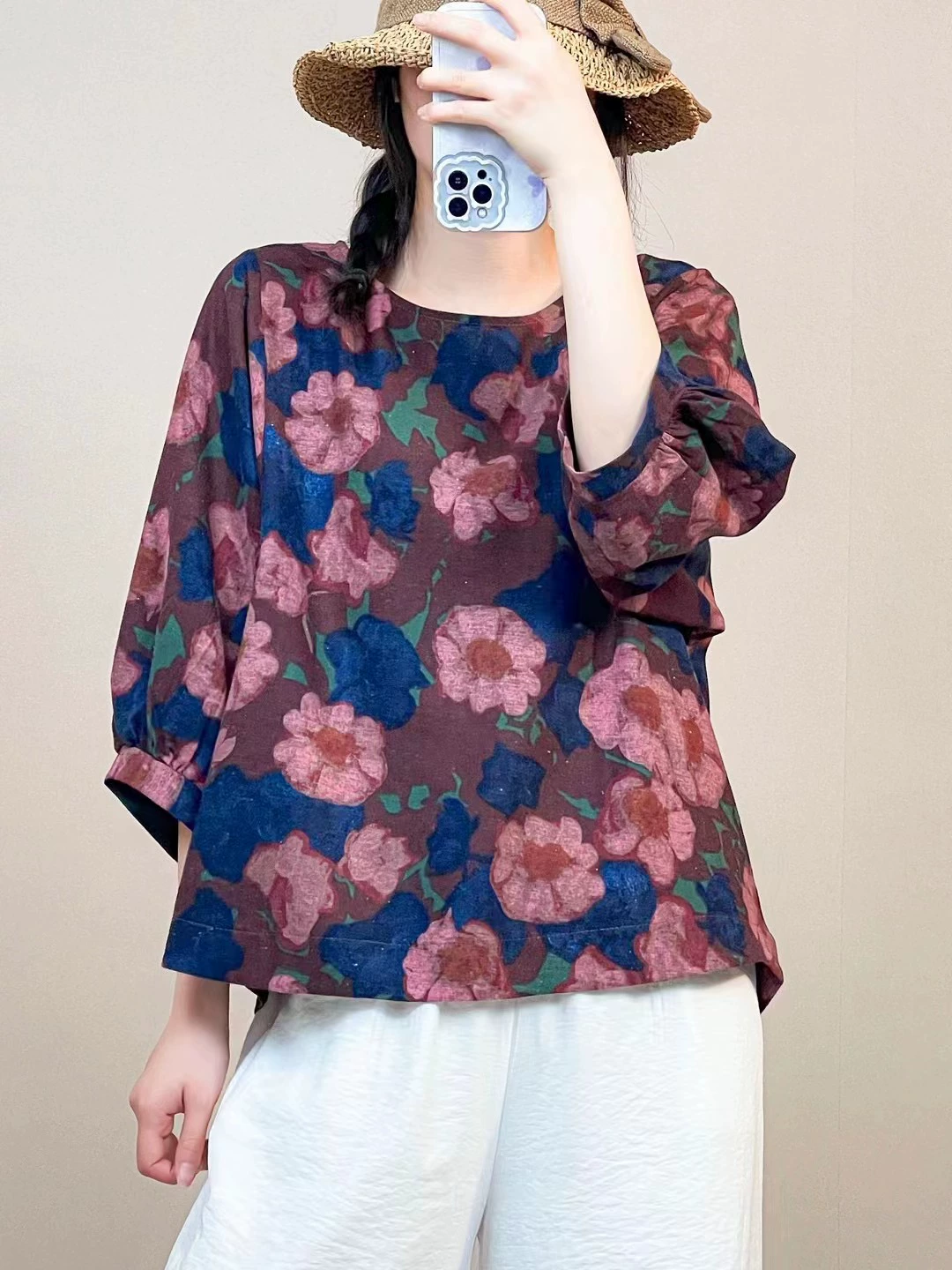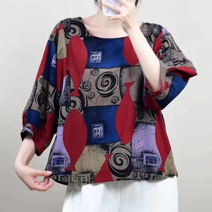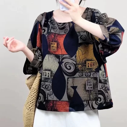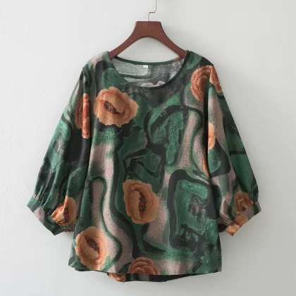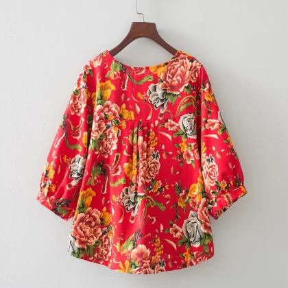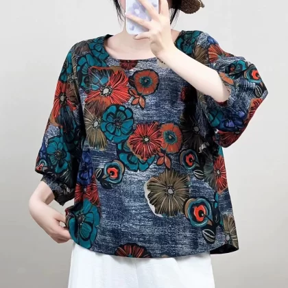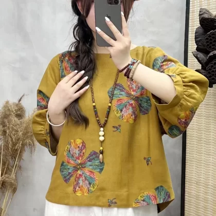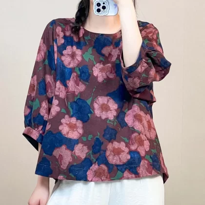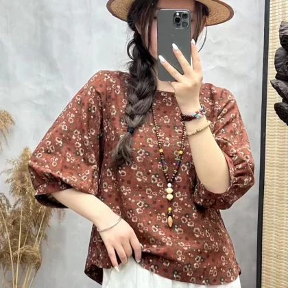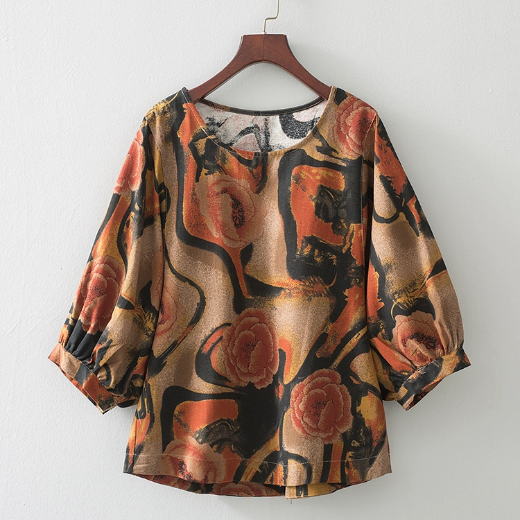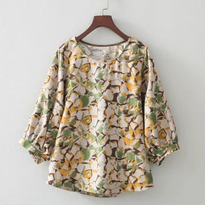 | nameOriginal | Cotton and linen floral lantern sleeve loose artistic breathable T-shirt |