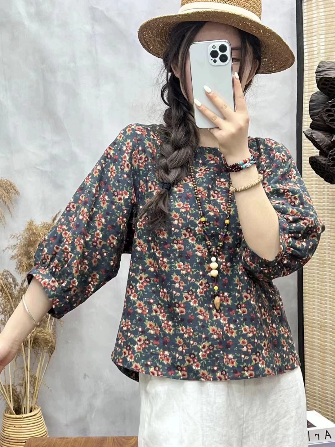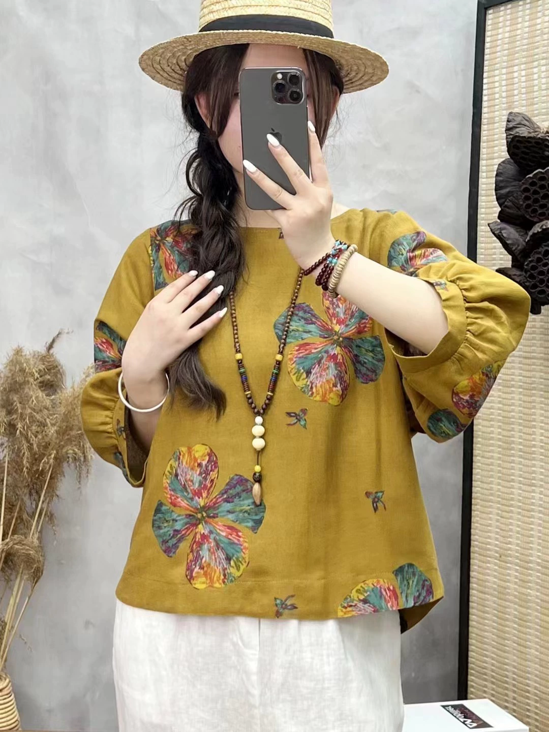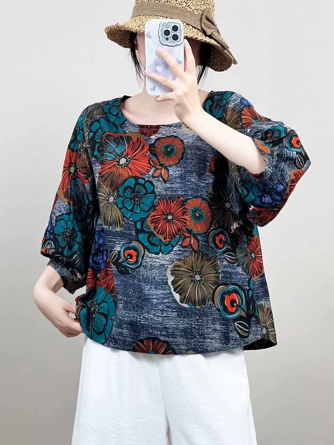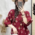 | nameOriginal | Cotton and linen floral lantern sleeve loose artistic breathable T-shirt |