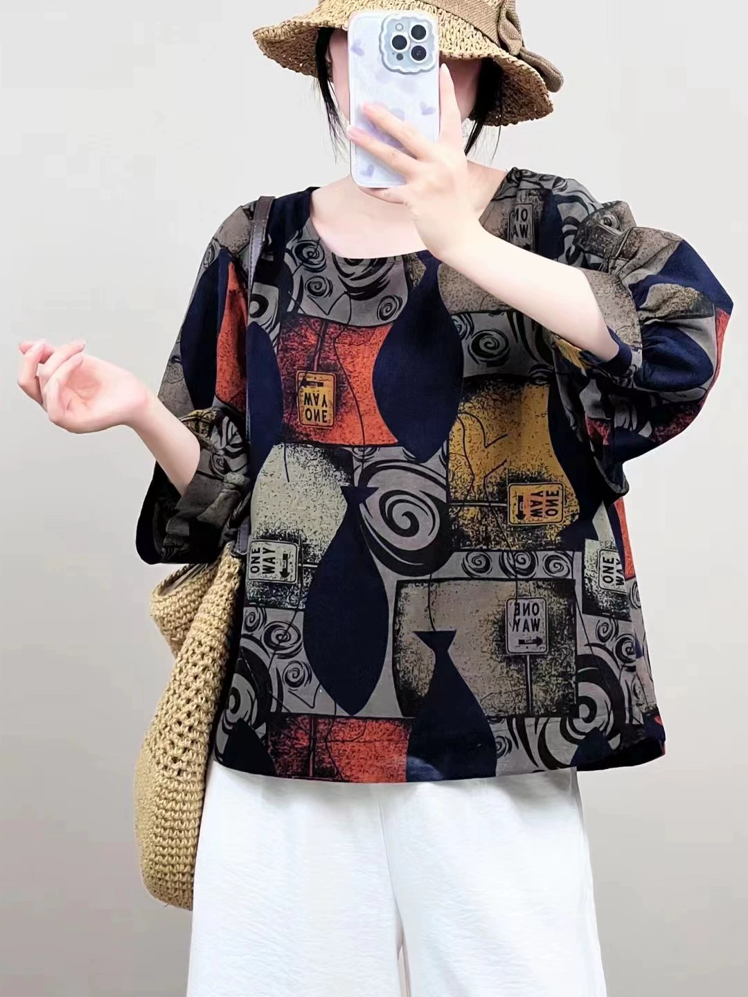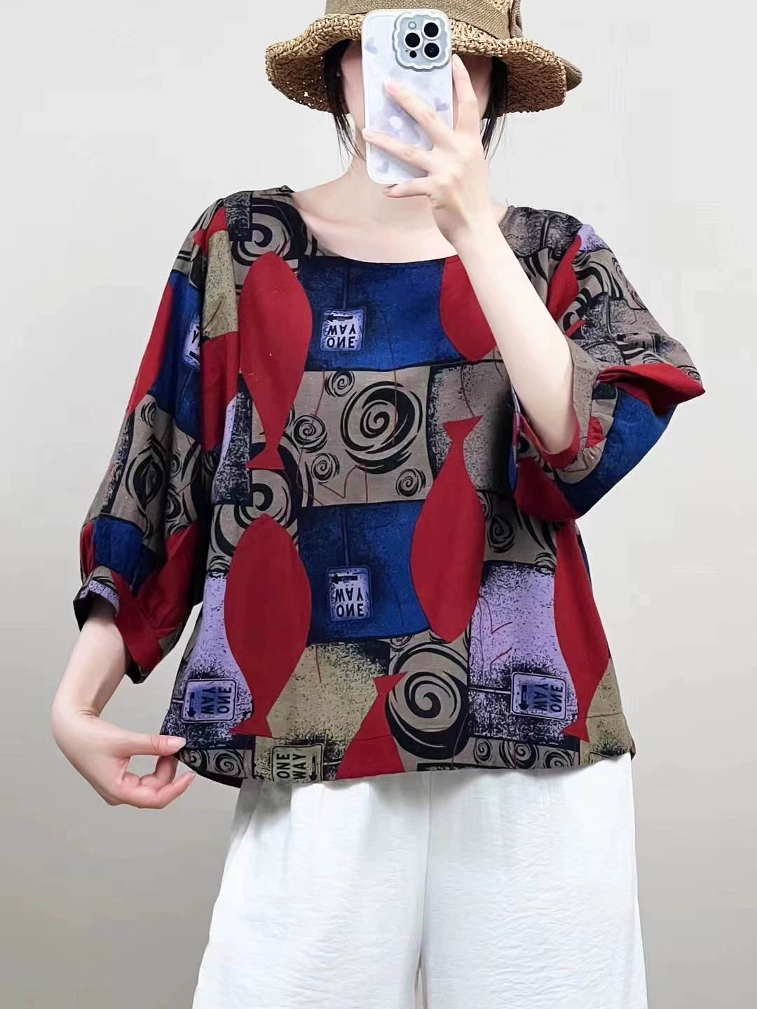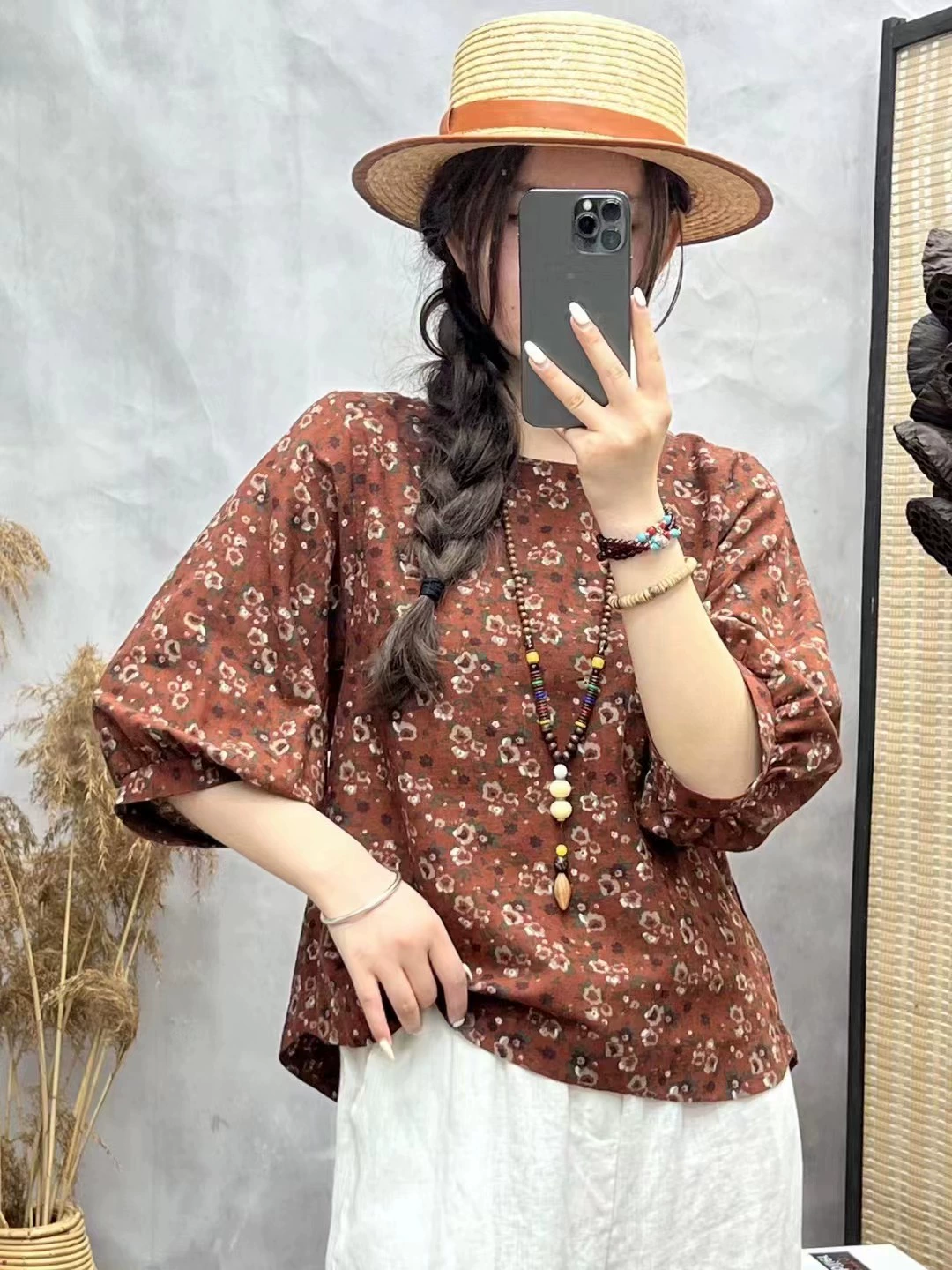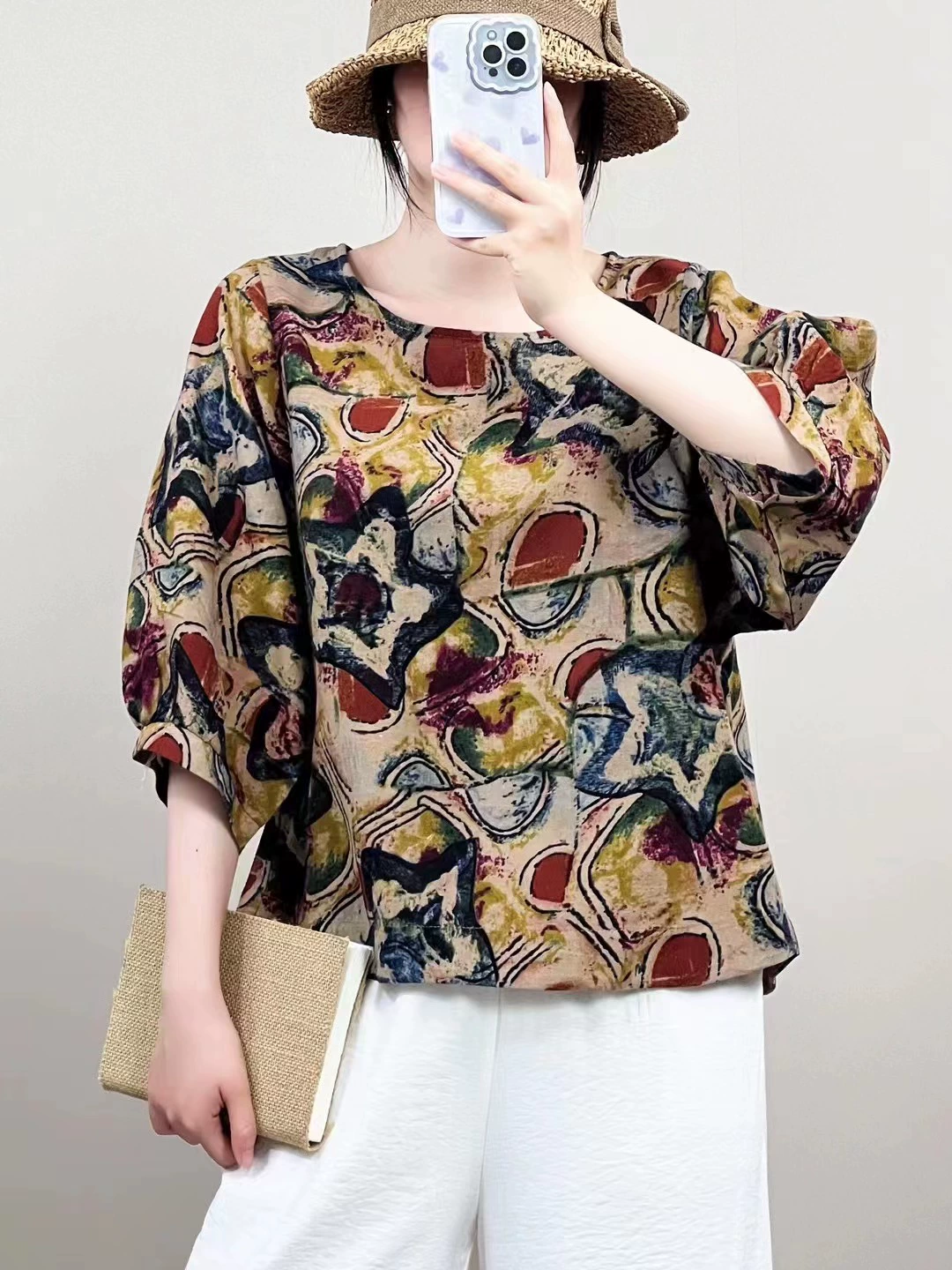 | nameOriginal | Cotton and linen floral lantern sleeve loose artistic breathable T-shirt |