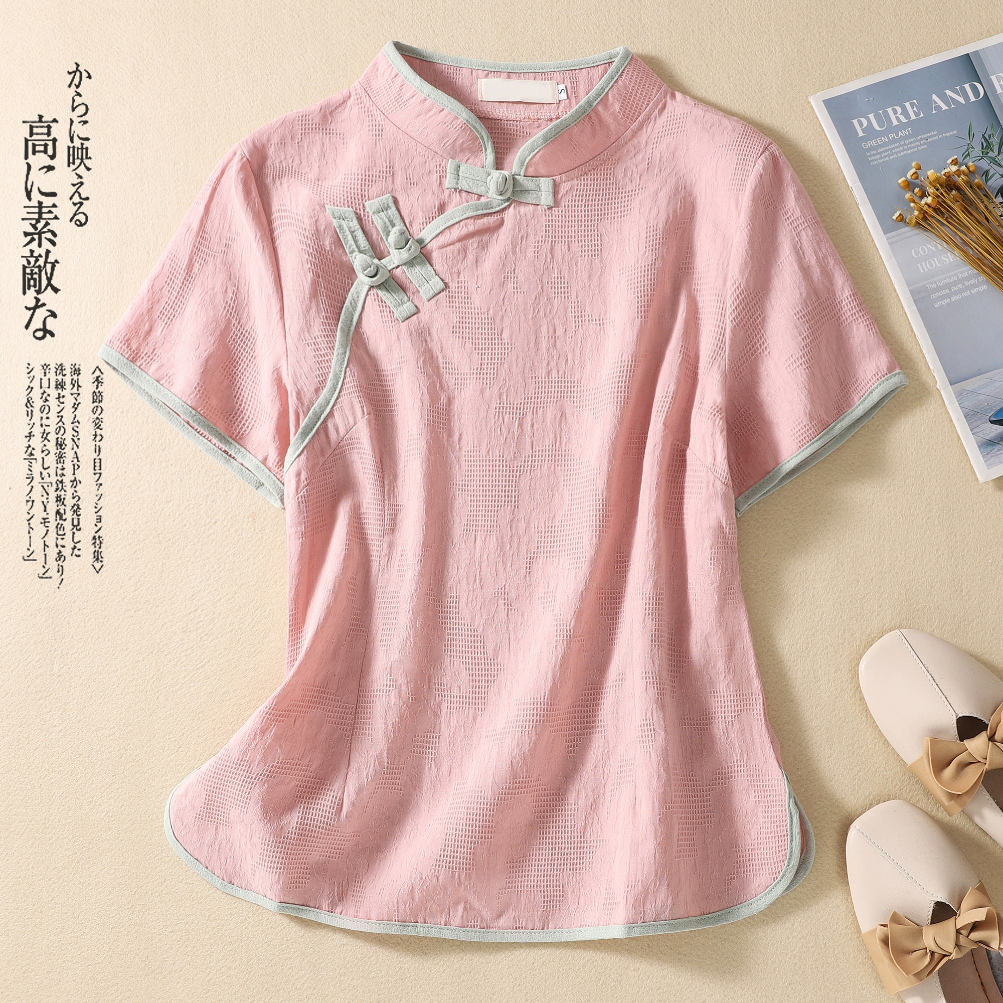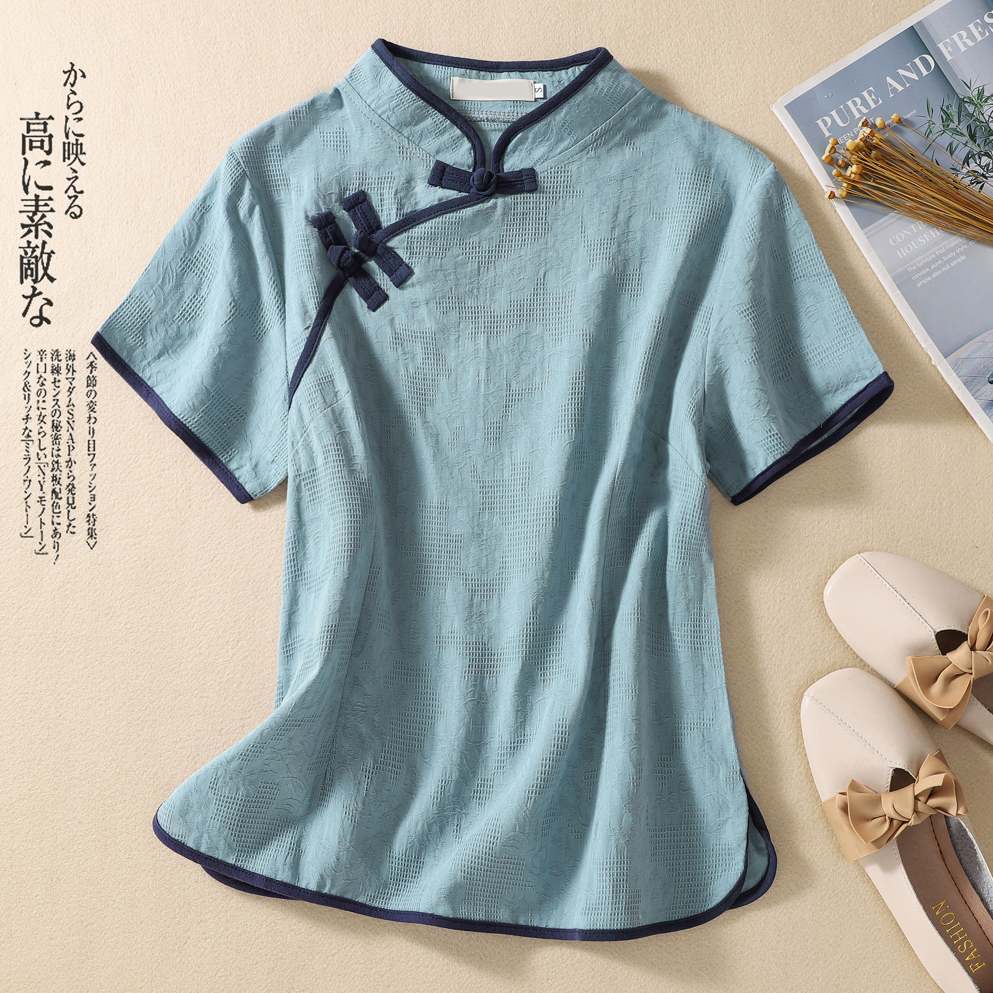| nameOriginal | Cotton and linen retro stand collar slanted placket short-sleeved shirt T-shirt |