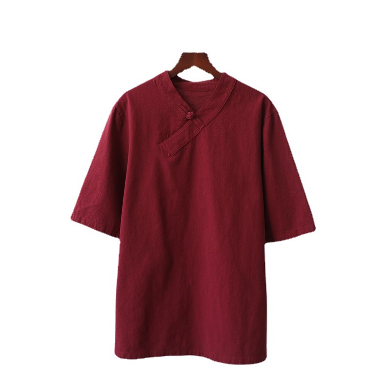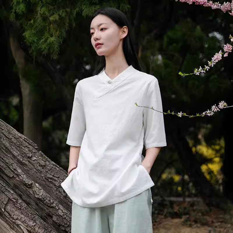 | nameOriginal | Cotton and linen women's 2023 spring and summer new national wind retro V neck plate buckle short sleeve tshirt overalls female tea suit |