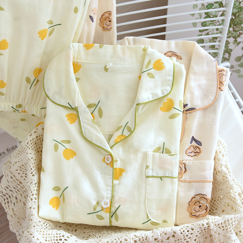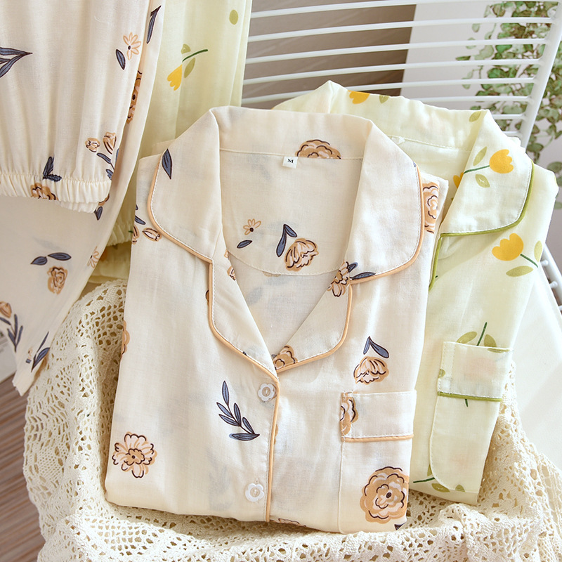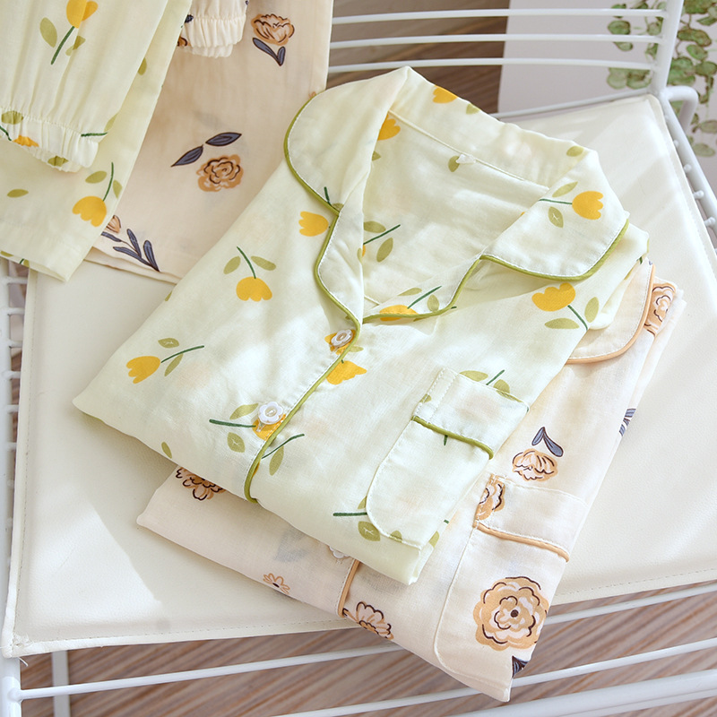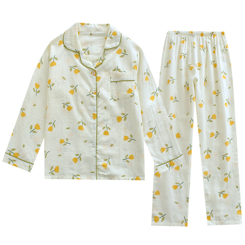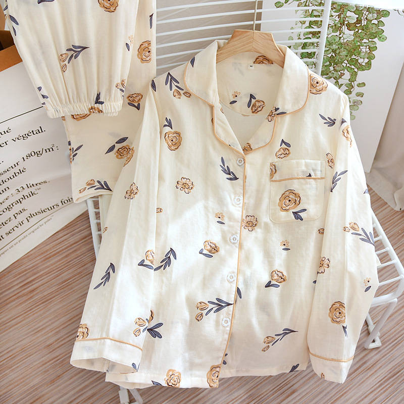 | nameOriginal | Cotton double-layer gauze pajamas suit women's four seasons thin long-sleeved trousers mother's home wear lapel can be worn outside |