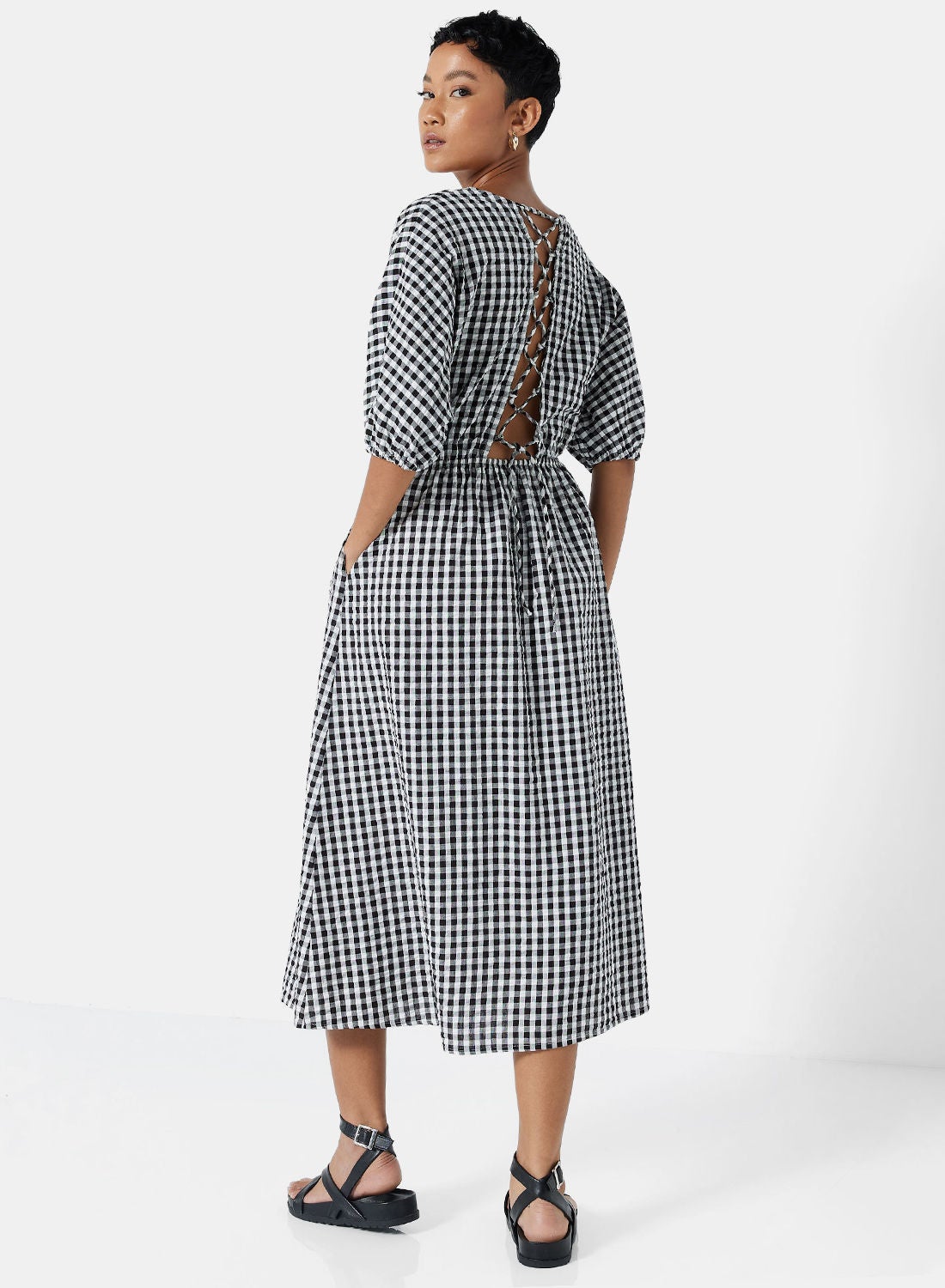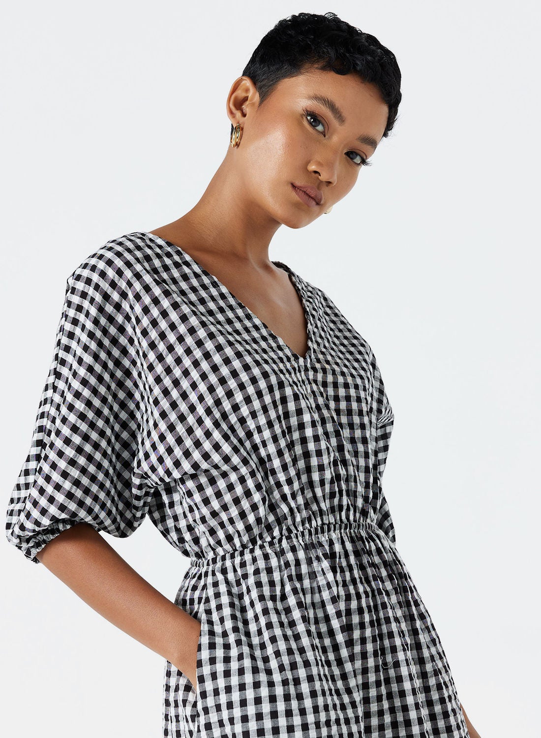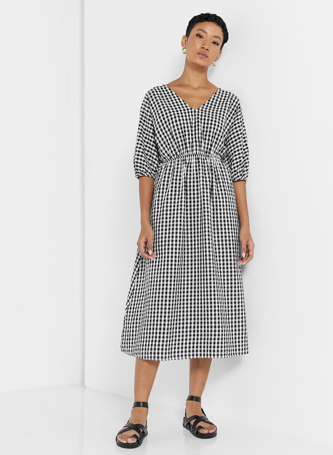 This product features a cozy and textured cotton material that provides comfort. It showcases a classic gingham pattern print all over the fabric. The dress has a V-neckline and three-quarter sleeves, with a cross-over strap detail at the back. The waist is elasticated, allowing for an adjustable fit. The dress has a regular fit and falls to a midi length. To maintain its quality, please follow the care label instructions when washing. The model in the photo is approximately 172 cm tall and is wearing a size S.