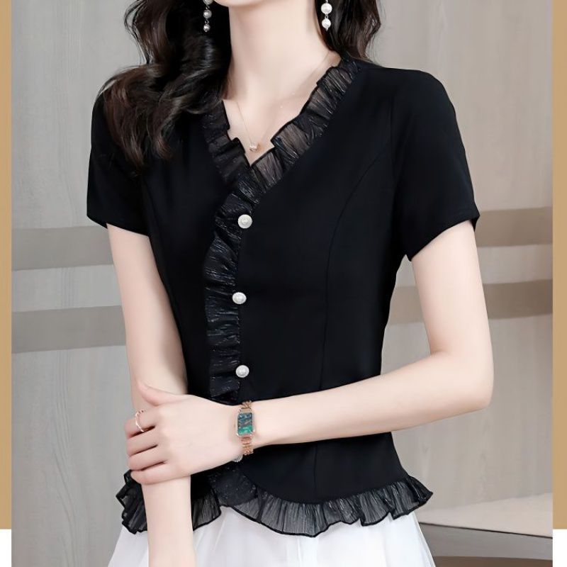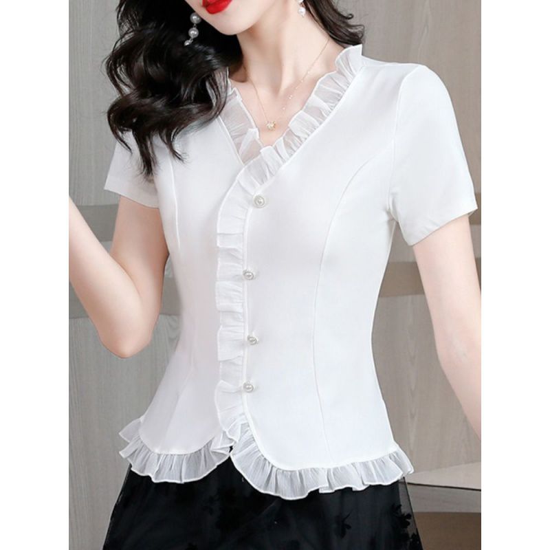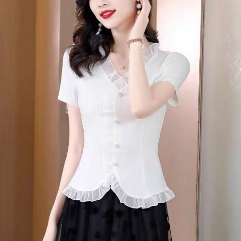 | nameOriginal | Cotton High-end Ruffled Summer Women's 2023 New Western Style Shirt All-match Slim-fit Slimming Age-reducing Short-sleeved Top |