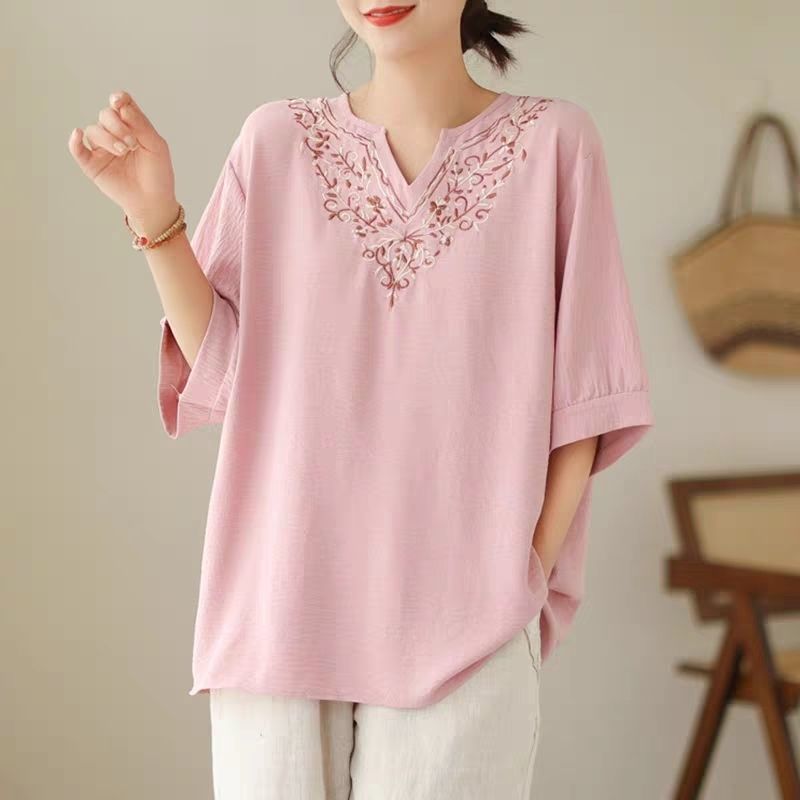 | nameOriginal | Cotton Large Size V-neck Embroidered Short-sleeved T-shirt Women's Chubby Mother's Summer Dress Korean Style Loose Meat-Covering Slimming Half-sleeved Top |
