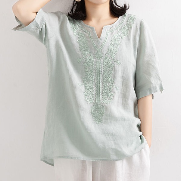 | nameOriginal | Cotton Linen Short-sleeved Shirt Women's Loose Large Size 2023 Summer New Artistic Retro Ethnic Embroidered Solid Color V-neck Shirt |