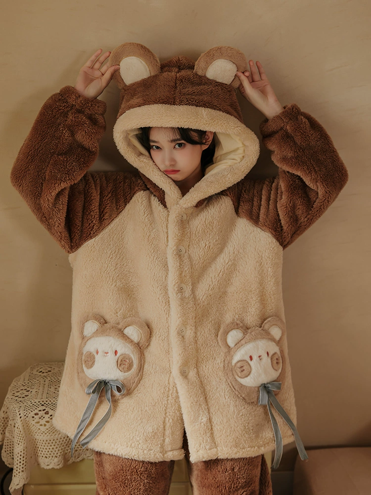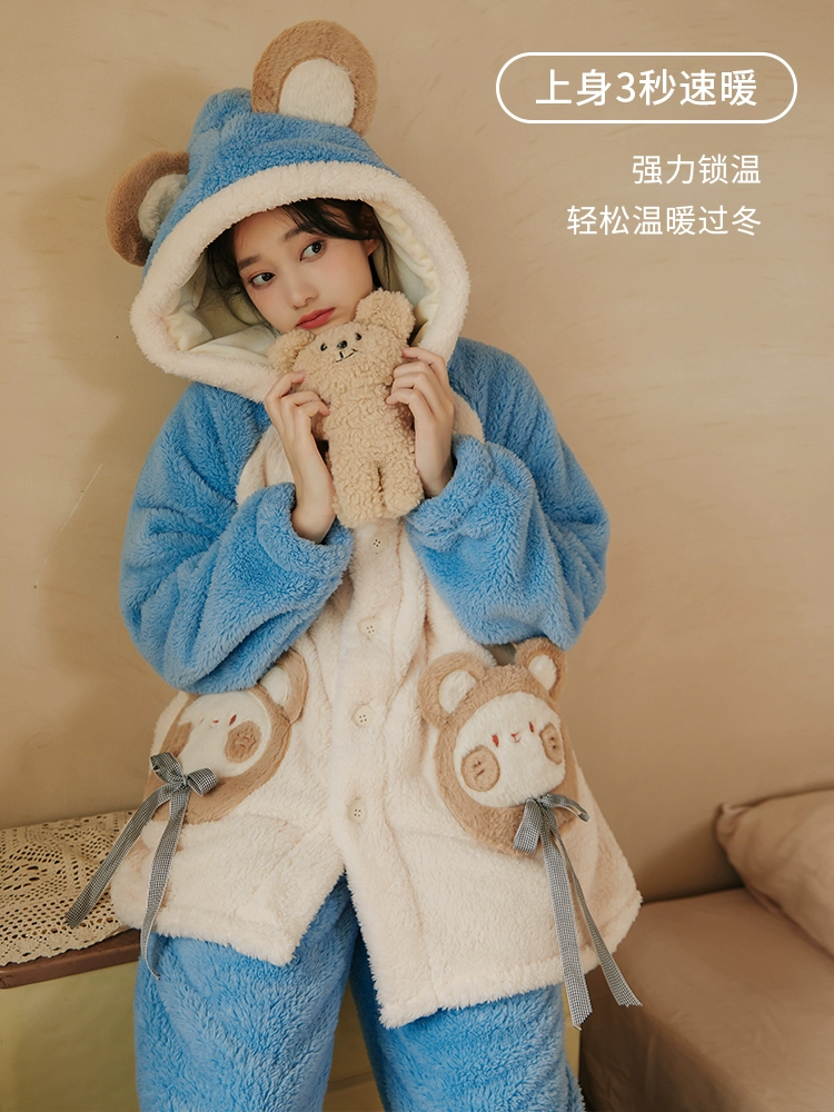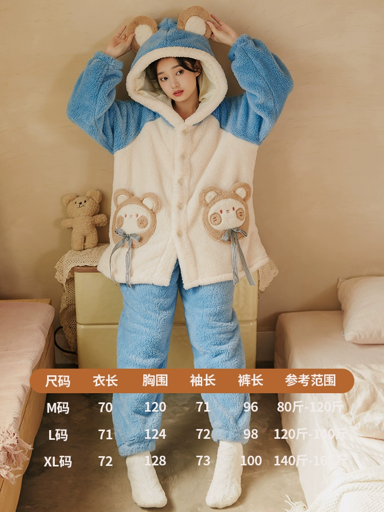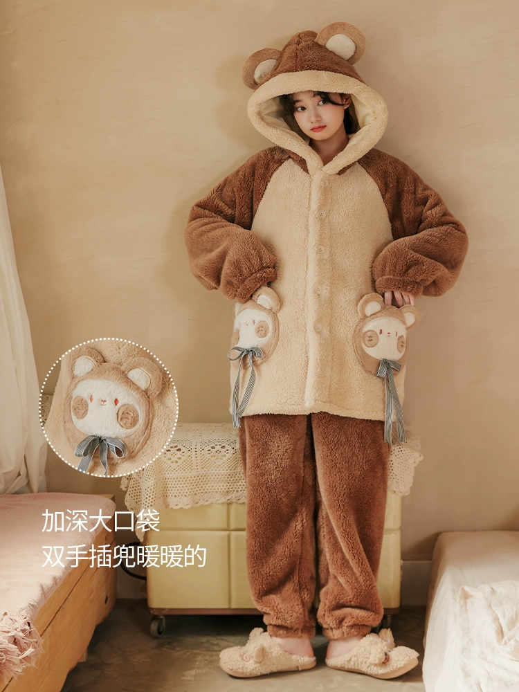 | nameOriginal | Cotton seed shell new winter pajamas for women thickened and velvet warm home clothes cute bear coral velvet suit |