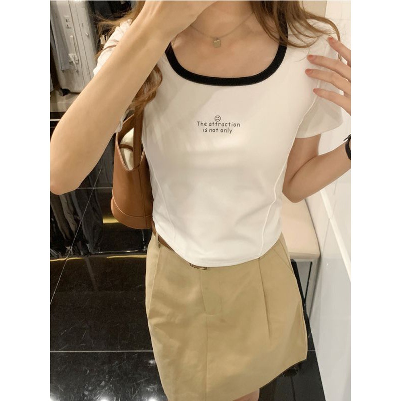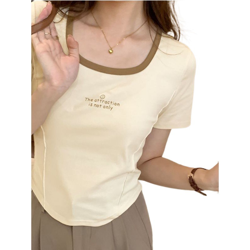 | nameOriginal | Cotton Shoulder Square Collar Short-sleeved Shirt Women's Color-matching Pure Desire Spice Girls Slim-fit Slimming Clavicle Short Fishbone Top |