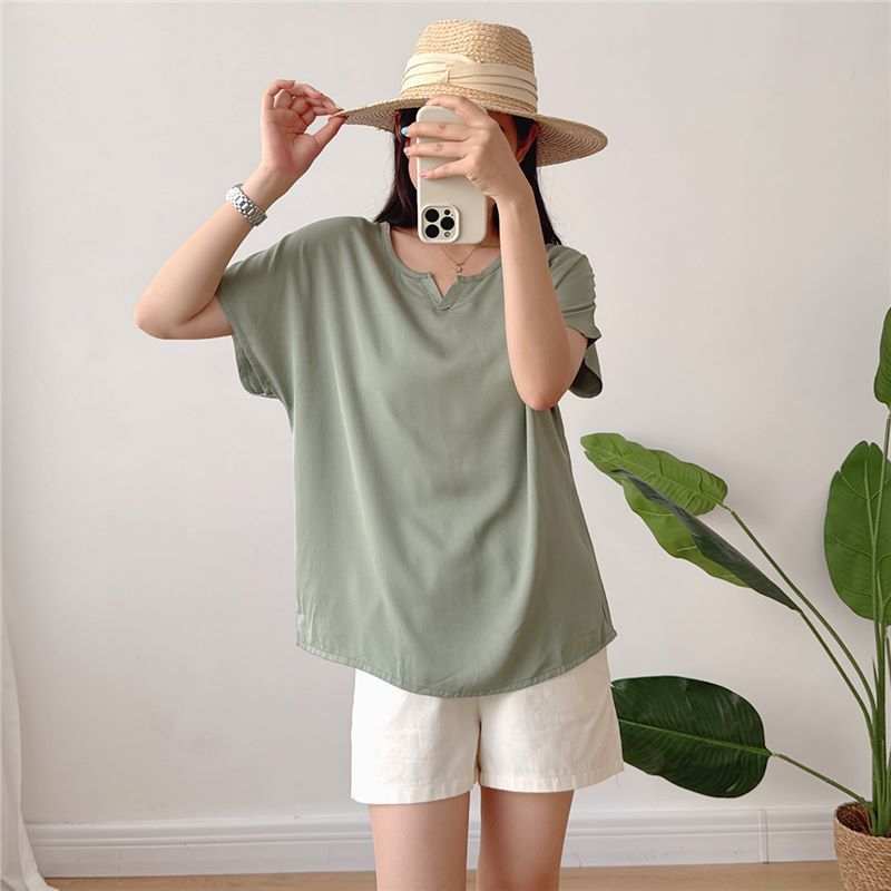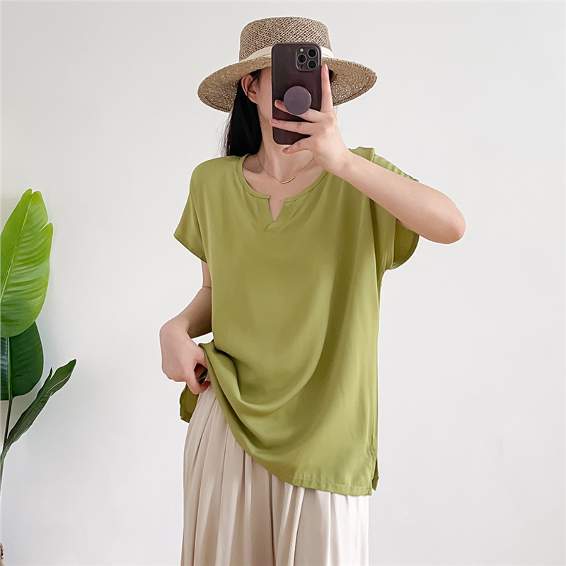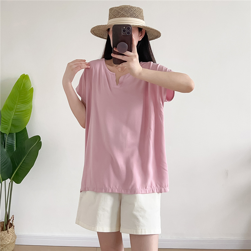 | nameOriginal | Cotton Silk Top Women's 2024 Summer Thin Loose plus size Short Sleeve V-Neck Fashionable Solid Color Artificial Cotton T-Shirt Shirt |