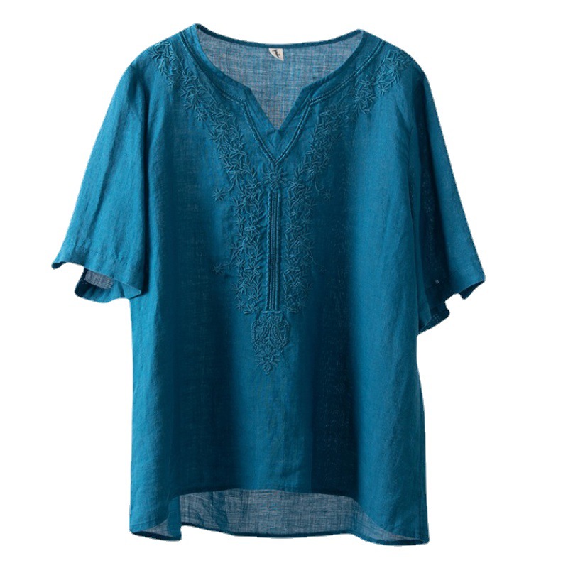 | nameOriginal | Cotton V-neck Summer New Cotton Linen Shirt Women's Artistic Loose Pullover Embroidered Short-sleeved T-shirt Women's Embroidered Top Trendy |