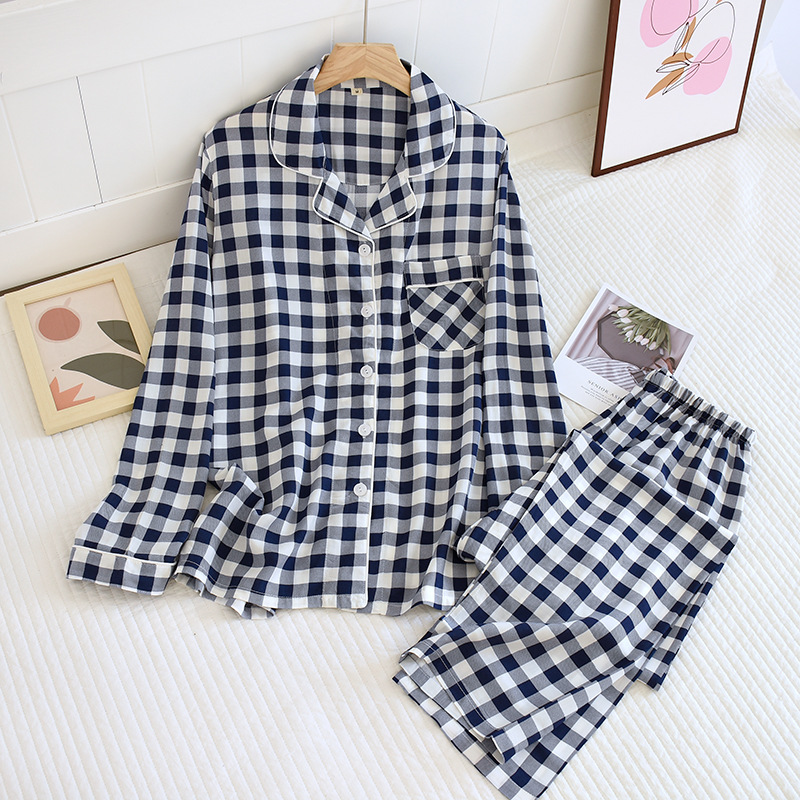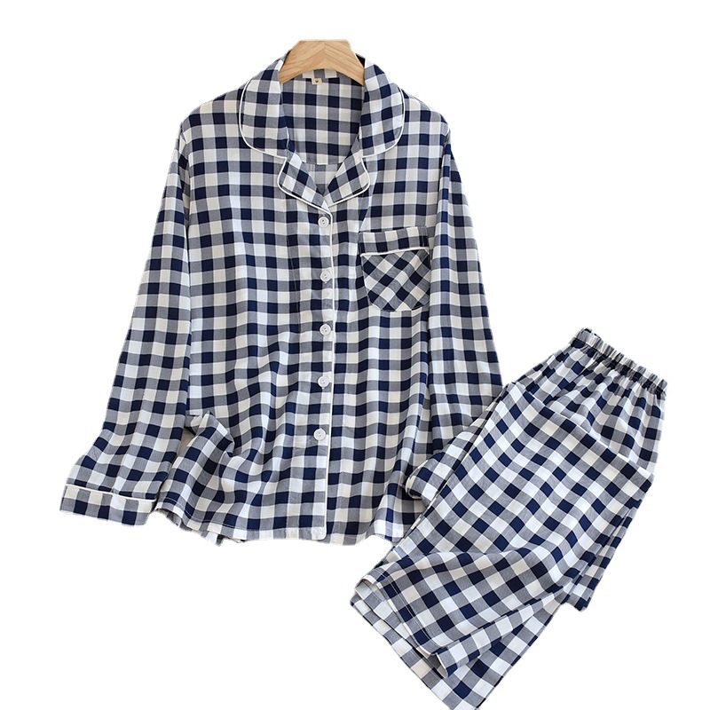 Couple pajamas Spring and Autumn new men’s and women’s plus size home wear simple style cotton yarn crepe washed double-layer gauze