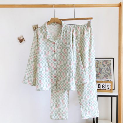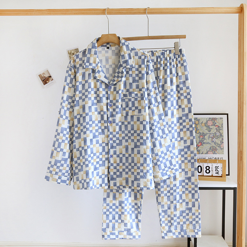 Couple Pajamas Women’s Washed Cotton Double-Layer Crepe Long-Sleeved Trousers Spring and Autumn Thin Simple Contrast Color Plaid Home Clothes