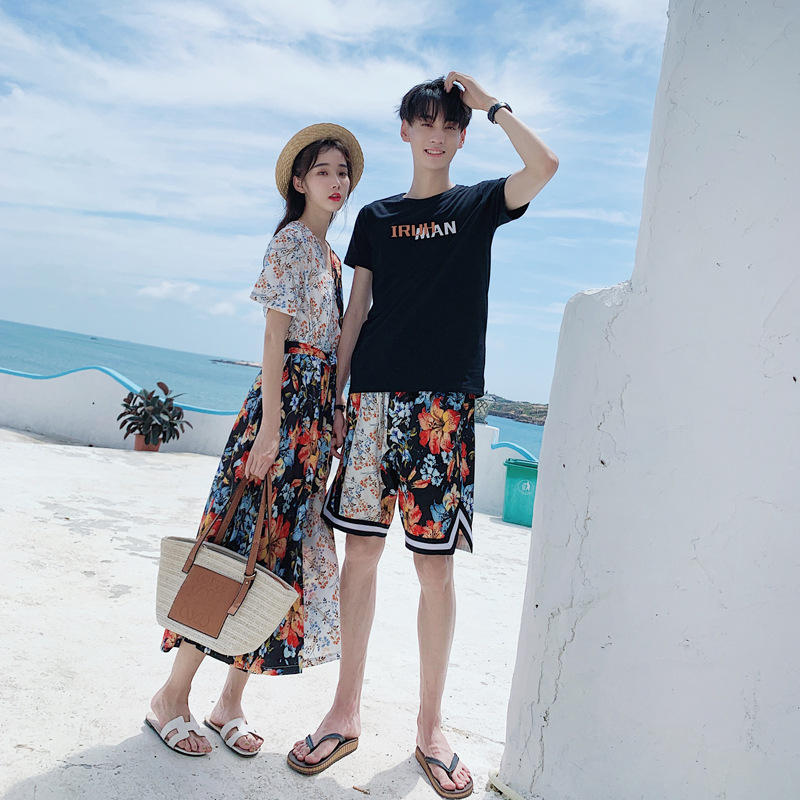 | nameOriginal | Couple's Beach Suit 2019 New Seaside Holiday Style Contrast Color Stitching Women's Jumpsuit Men's Short-sleeved T-shirt Set |