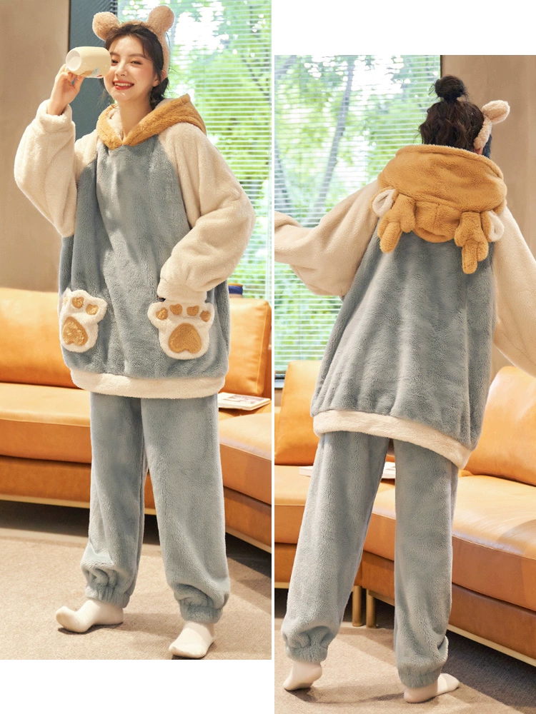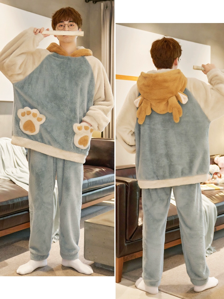 Couple pajamas, autumn and winter coral velvet men, ladies plus velvet thickened flaw -hooded hooded winter home service winter