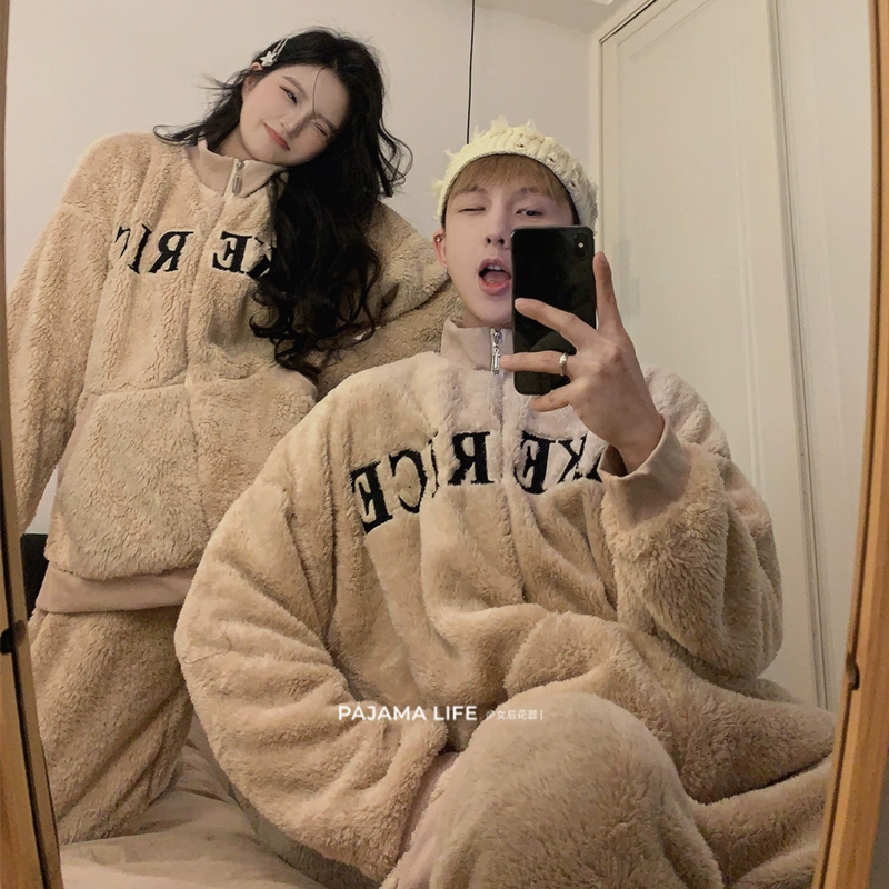Couple’s pajamas autumn and winter style coral velvet thickened velvet zipper simple letter high-end men’s and women’s home wear set