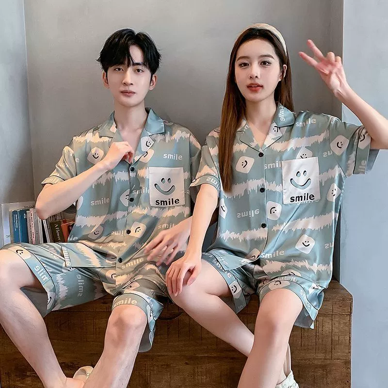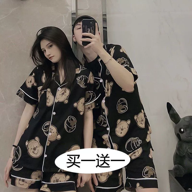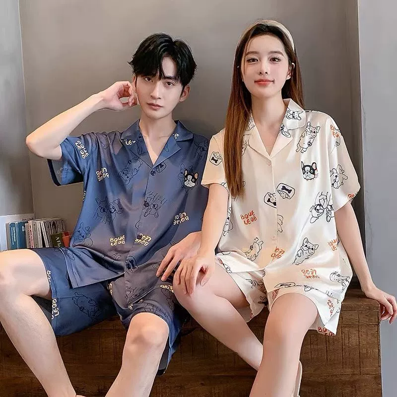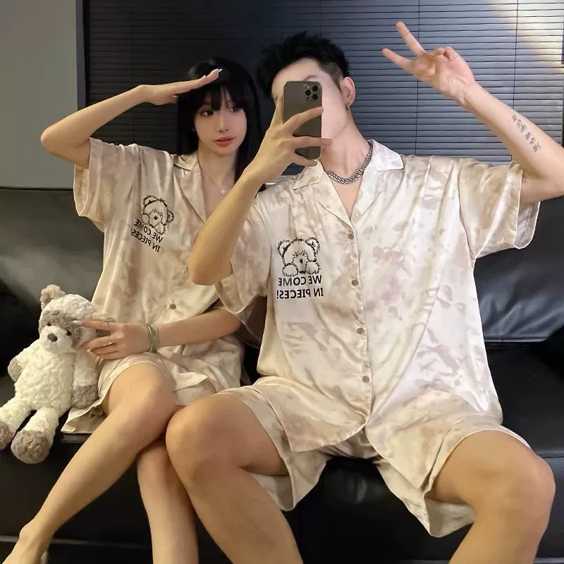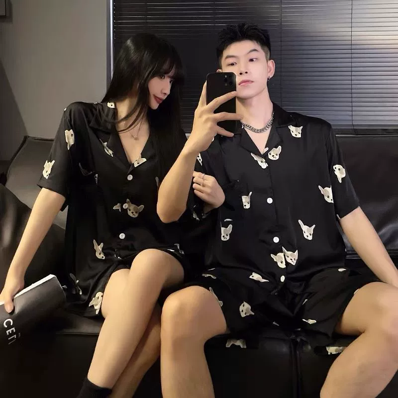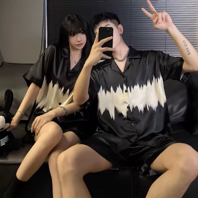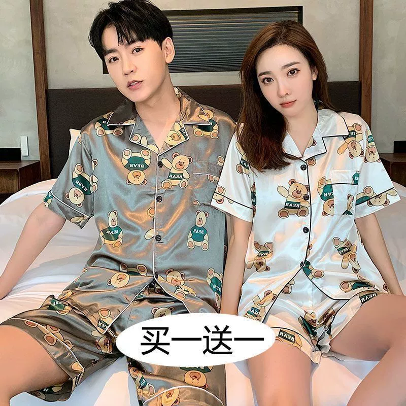 Crayon Shin-chan Cartoon Couple Pajamas Women's Summer Ice Silk Short Sleeve Shorts Striped Men's Heavenly Home Clothing Set