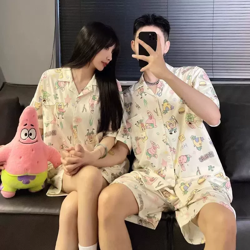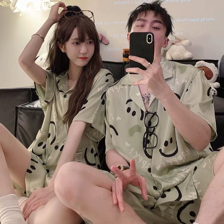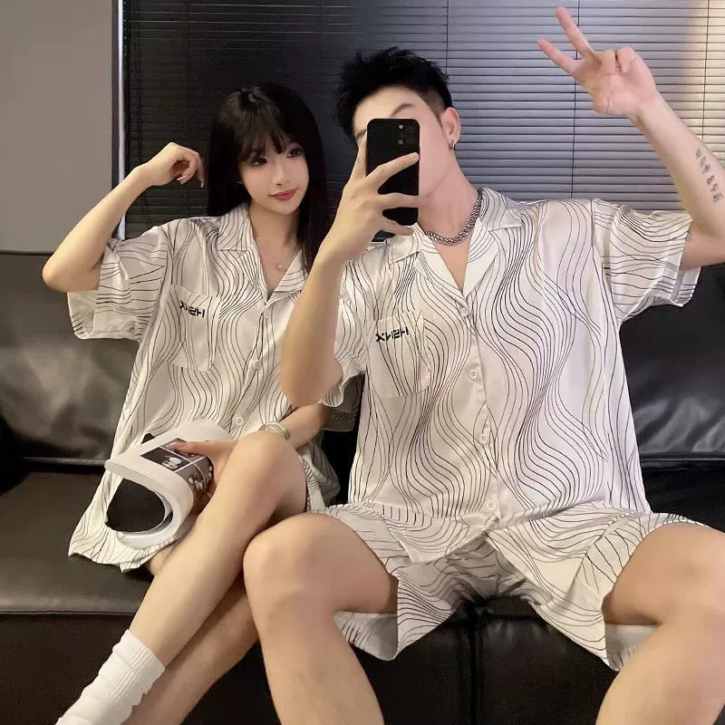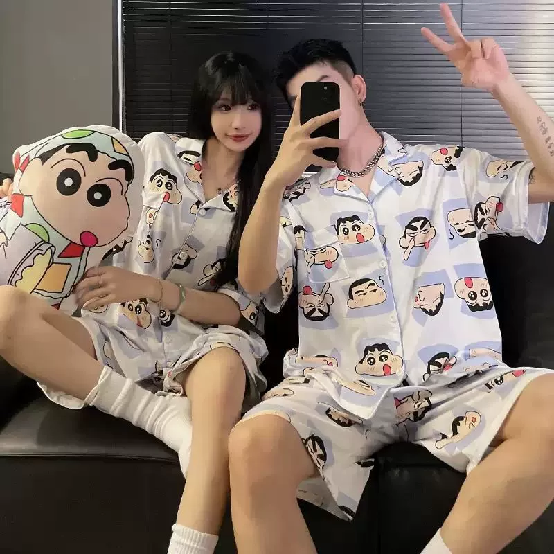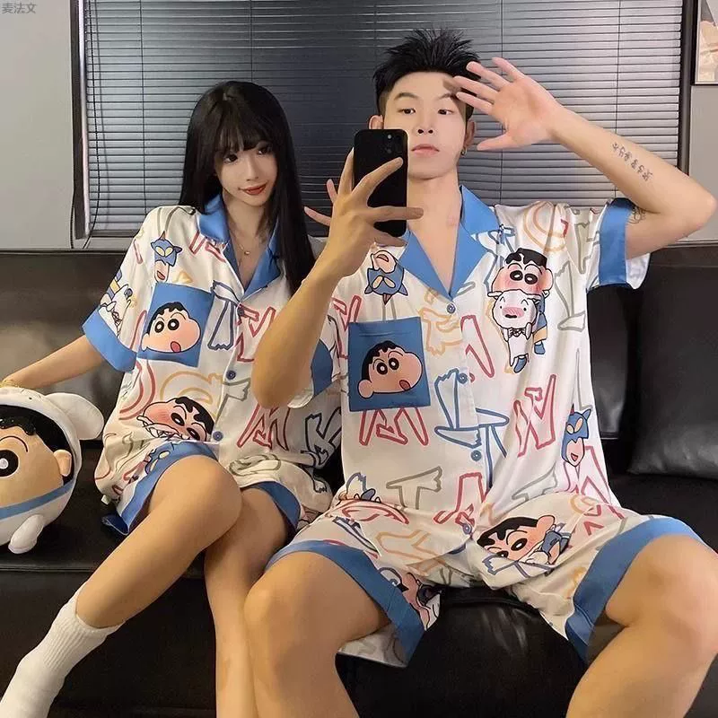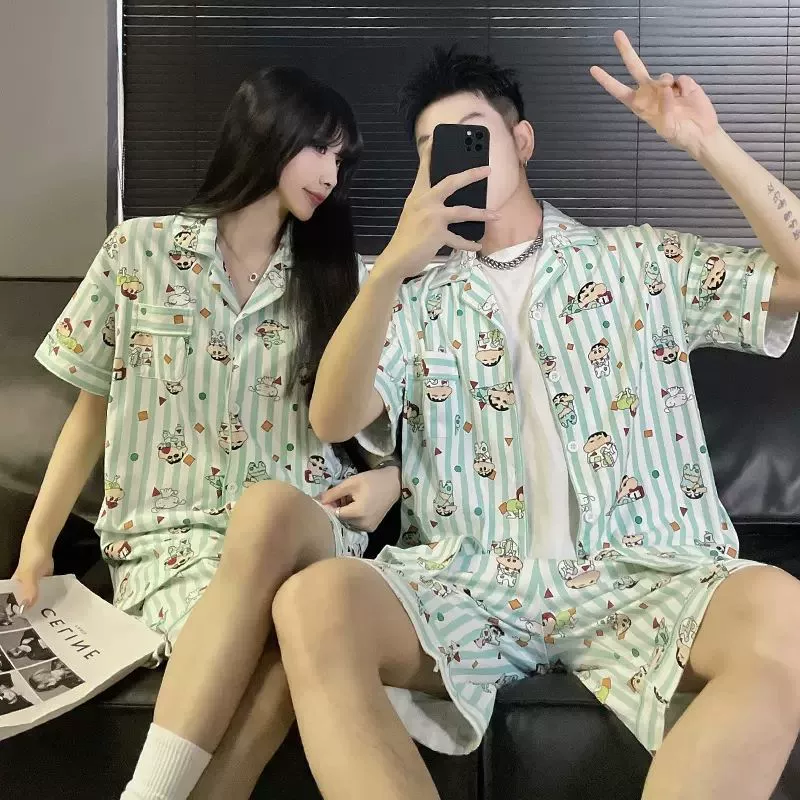 Crayon Shin-chan Cartoon Couple Pajamas Women’s Summer Ice Silk Short Sleeve Shorts Striped Men’s Heavenly Home Clothing Set