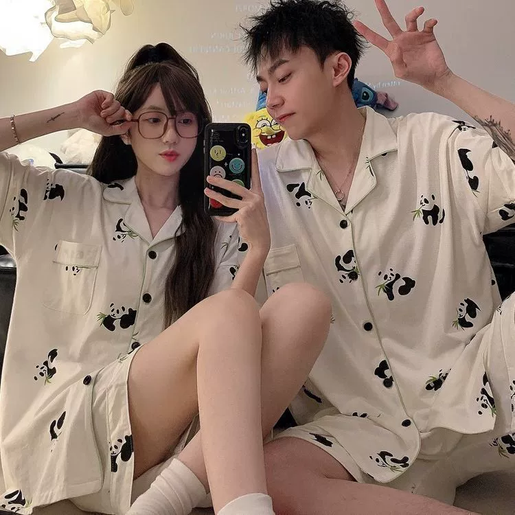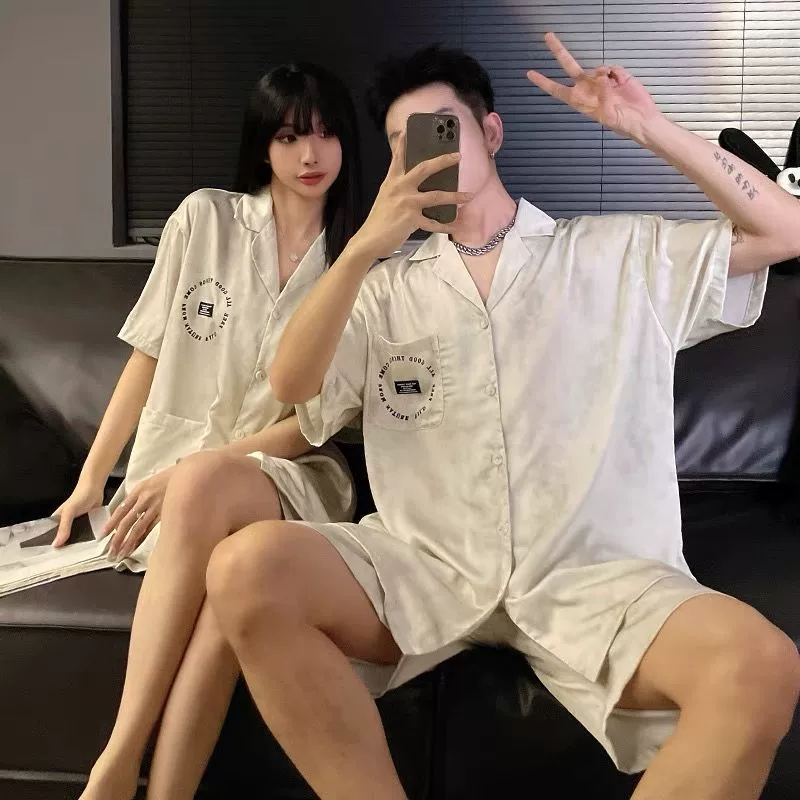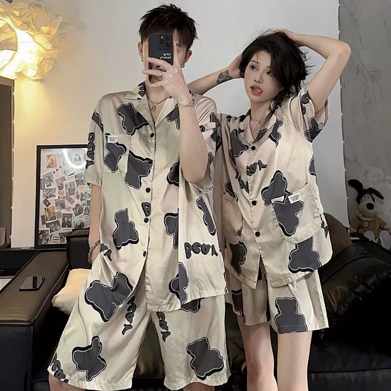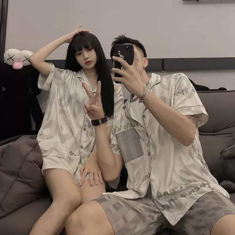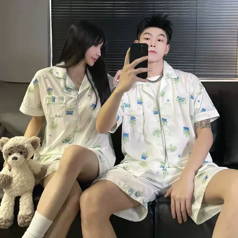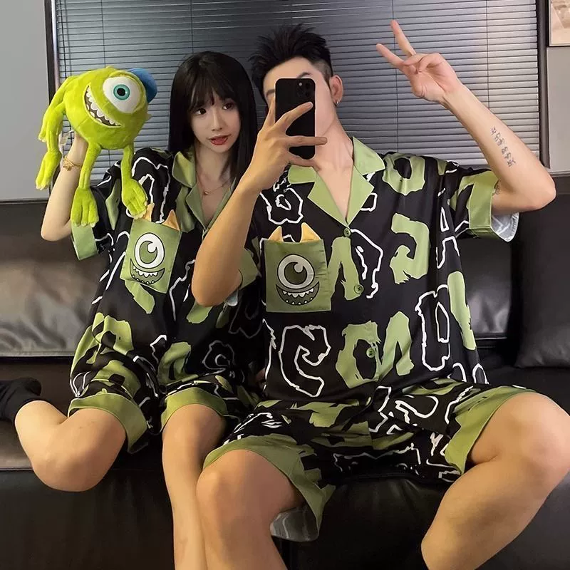Crayon Shin-chan Cartoon Couple Pajamas Women’s Summer Ice Silk Short Sleeve Shorts Striped Men’s Heavenly Home Clothing Set