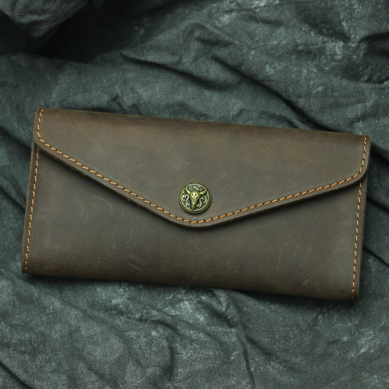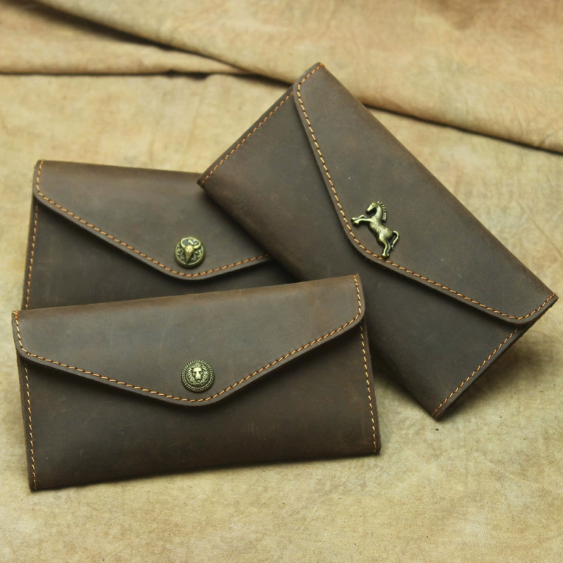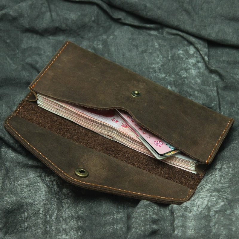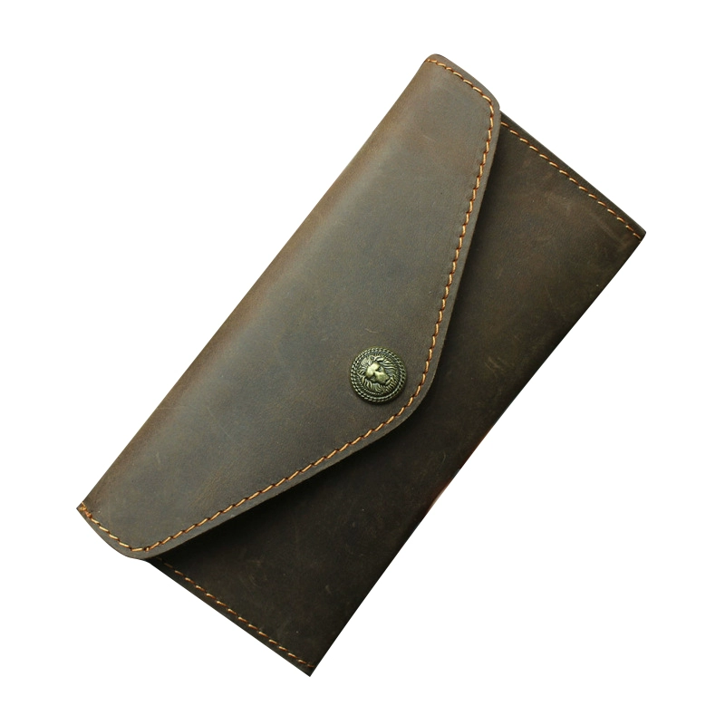 Crazy horse leather envelope for men and women, genuine leather wallet, cowhide mobile phone bag, long retro flip wallet, simple clutch bag
