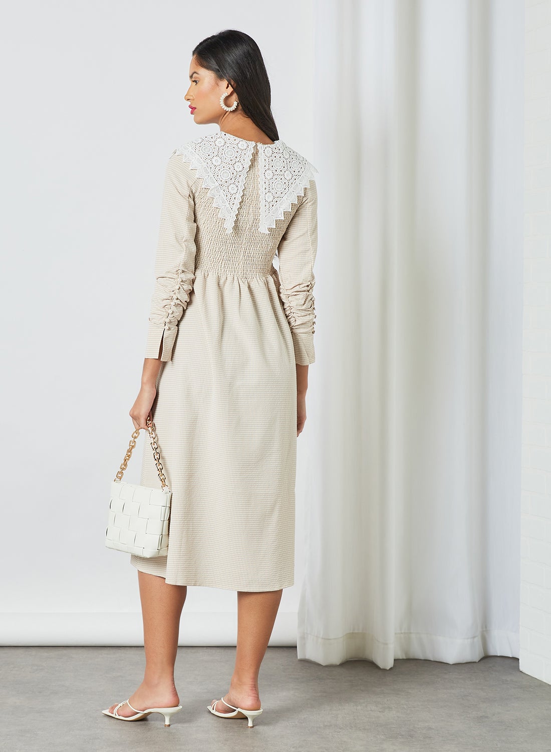 This product features a polyester blend fabric that is both lightweight and textured. It boasts a stylish micro checks pattern throughout and a round neckline with a crochet collar. The long sleeves are adorned with ruched button detailing, while the waistline features a flattering gather detail. The back of the garment is equipped with a concealed zipper closure for easy wear. To ensure proper care, please refer to the label instructions when washing.