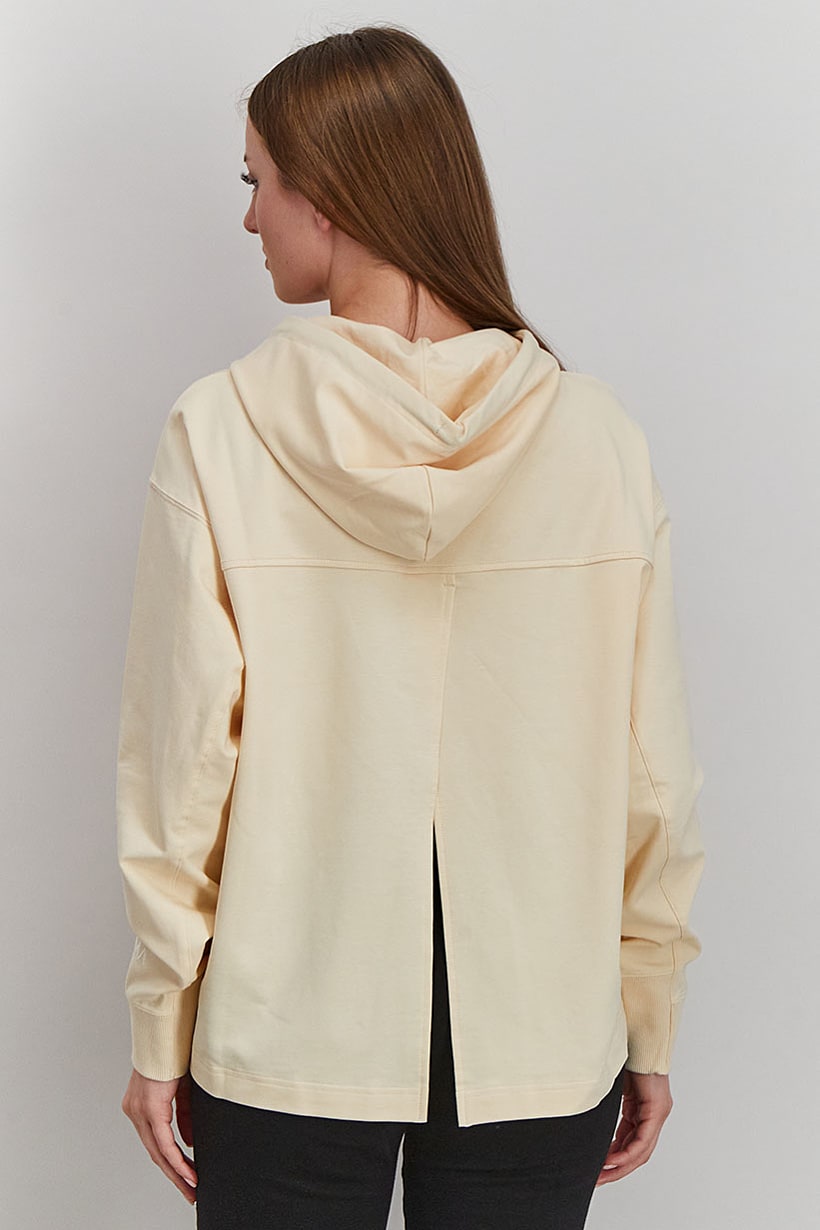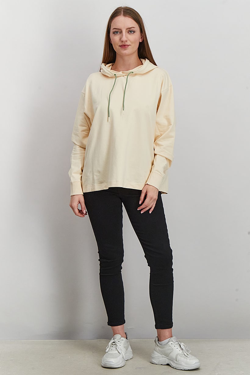 Cream Long Sleeve Sweatshirt with Hood and Drawstring for Women.