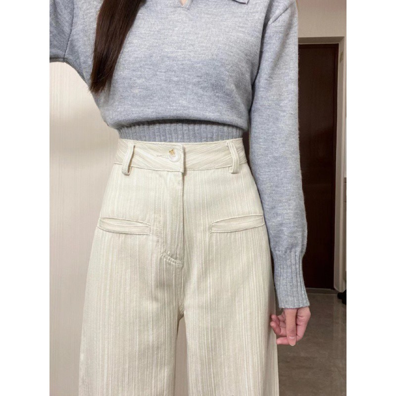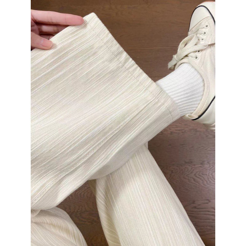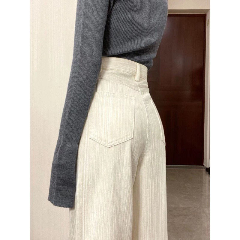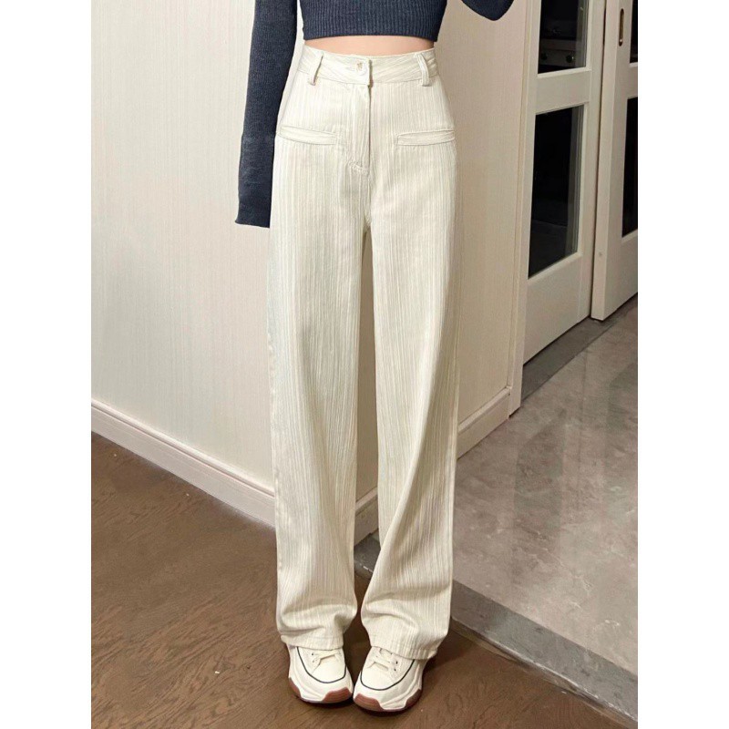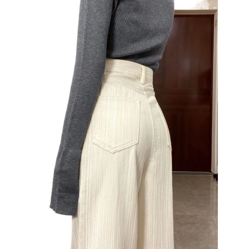 creamy-white Striped Casual Jeans Women's Spring and Summer New High Waist Slimming Wide Leg Pants Loose Dipped Trousers