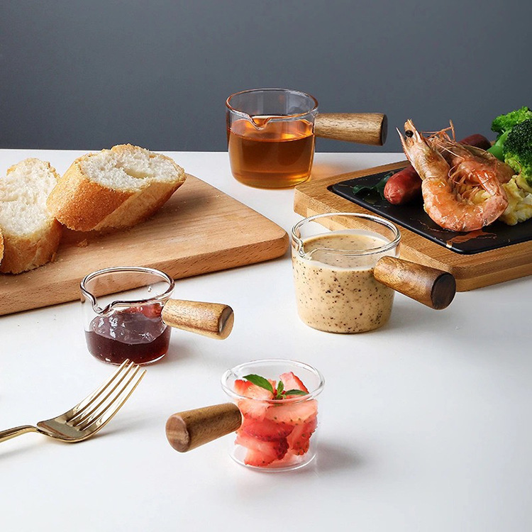 | nameOriginal | Creative glass sauce cup seasoning dish dip dish Mini small Milk Cup seasoning steak Western food sauce bucket wooden handle milk jar |