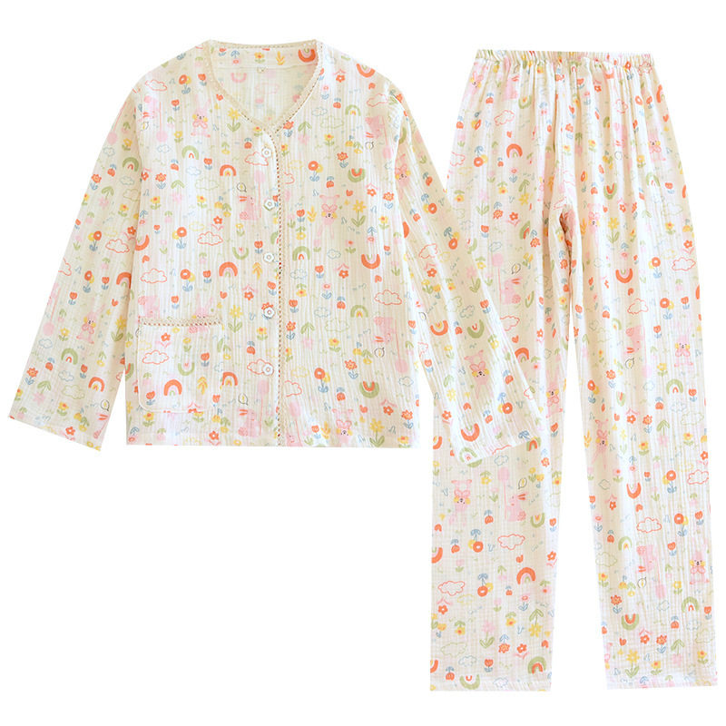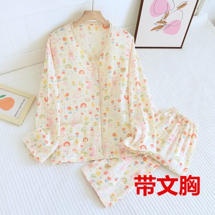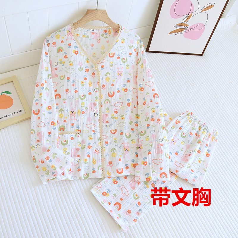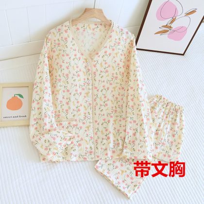 | nameOriginal | Crepe bra-free V-neck pajamas women's soft double-layer cotton yarn long-sleeved trousers with chest pad Four Seasons cotton thin suit |