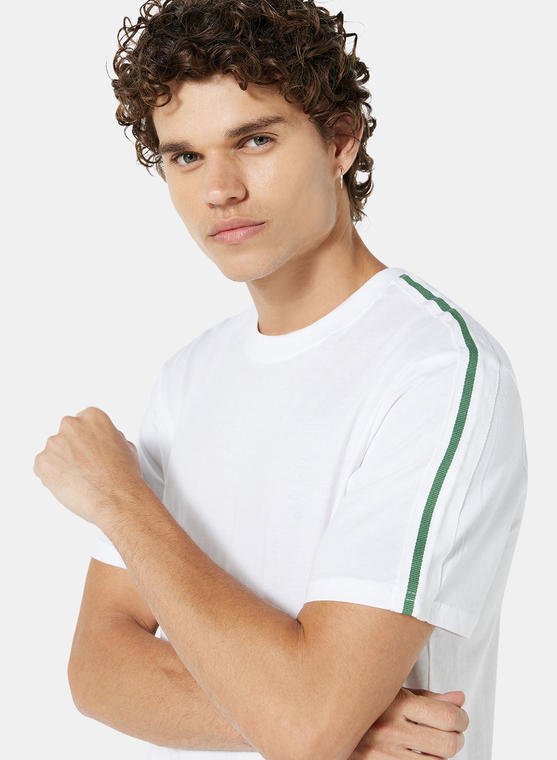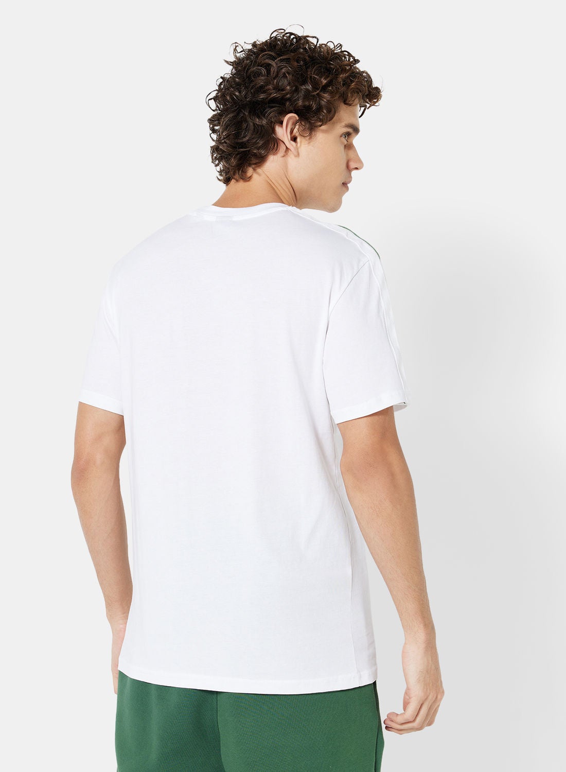 This product features a comfortable regular fit made from stretchy cotton fabric that has been sustainably sourced. It also includes contrast stripe panel inserts on the shoulders, a crew neck, and short sleeves. To maintain its quality, please follow the care label instructions when washing. The model shown is approximately 185 cm tall and is wearing a size M.