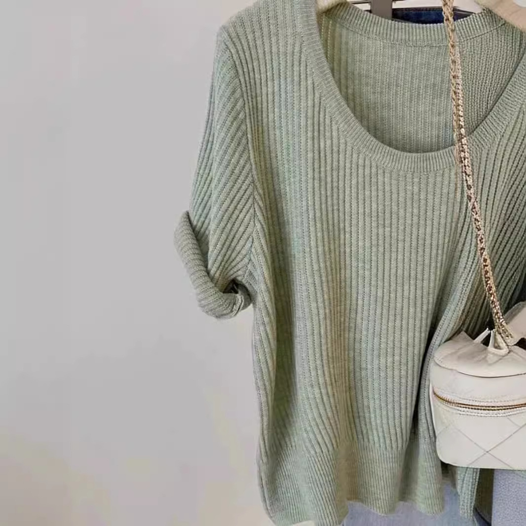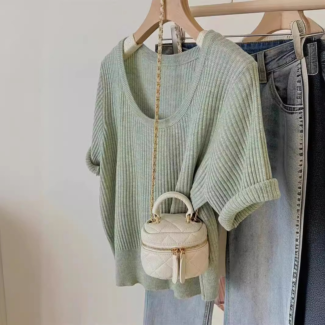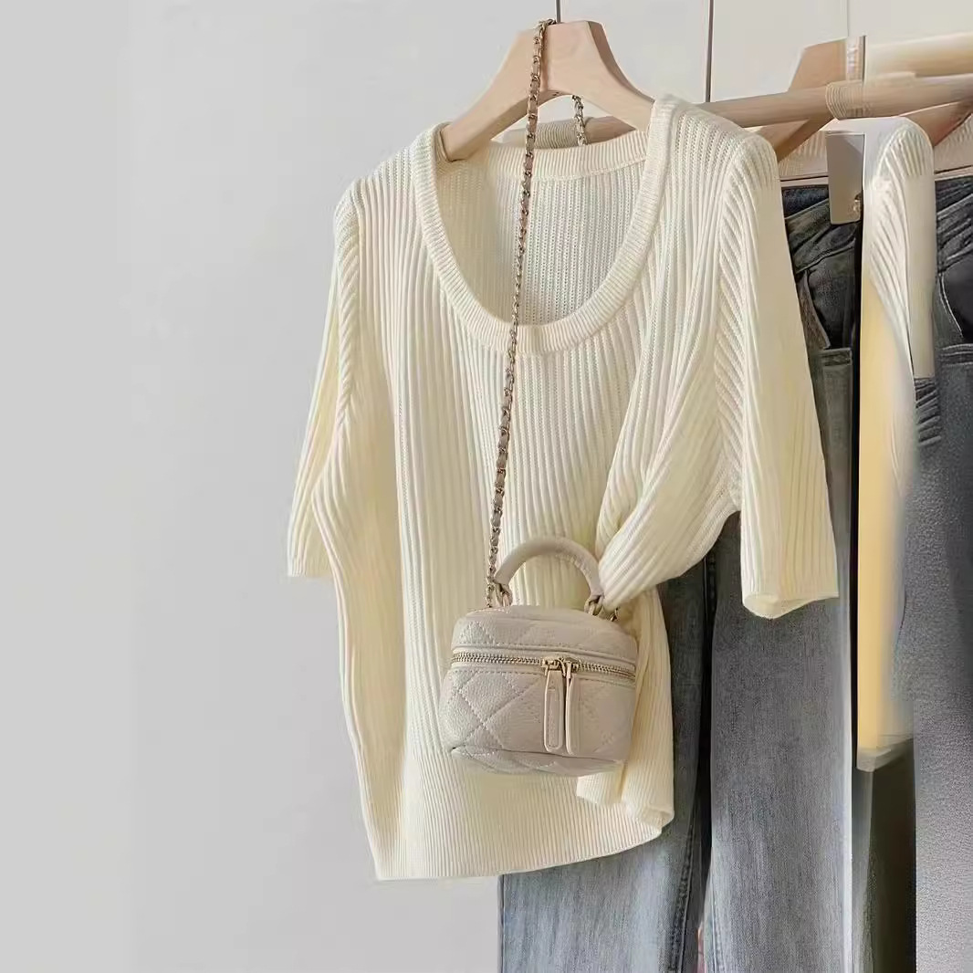 Crewneck ice silk sweater shoulder short sleeve T-shirt 2024 loose slim thin women’s summer-MY