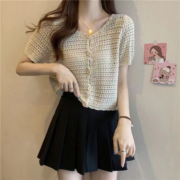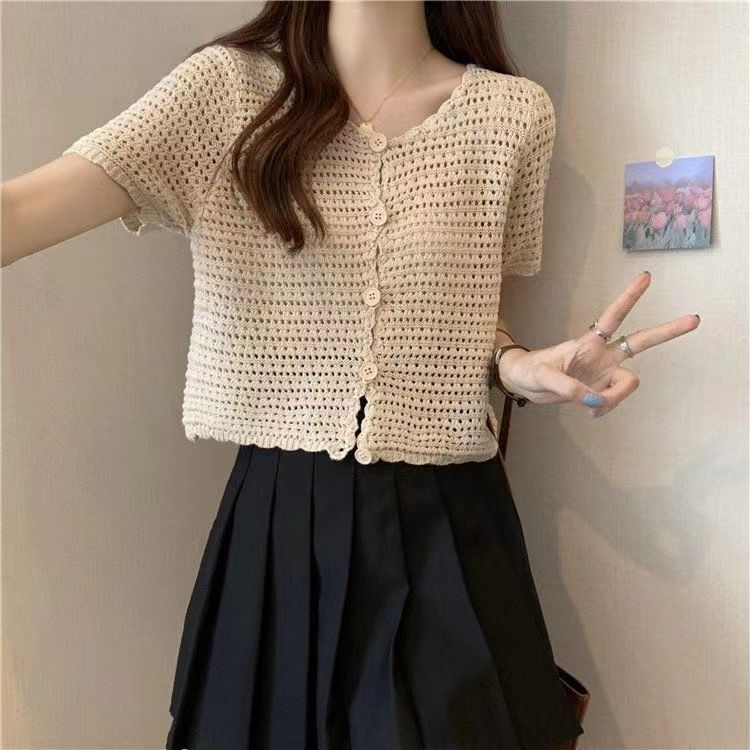 | nameOriginal | Crochet Hollow Imitation Ice Silk Knitted Cardigan Short-sleeved Women's 2024 Summer New French Style Elegant Short Shirt |