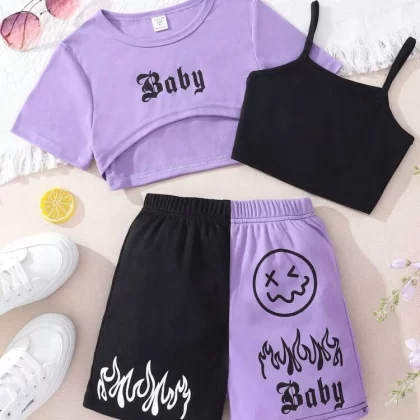 Introducing our Girls Crop Tee & Cami Top & Letter & Expression Print Shorts set, perfect for the fashion-forward young girl who loves to express herself through her clothing. The set includes a trendy crop tee and a comfortable cami top, both featuring a playful letter and expression print that adds a touch of fun to any outfit. The matching shorts complete the look, featuring the same print and a comfortable fit that allows for easy movement. Made with high-quality materials, this set is perfect for everyday wear or for dressing up for a special occasion. Your little girl will love the stylish and comfortable design of this set, and you’ll love the affordable price and easy care instructions. Order now and give your little fashionista the perfect addition to her wardrobe!