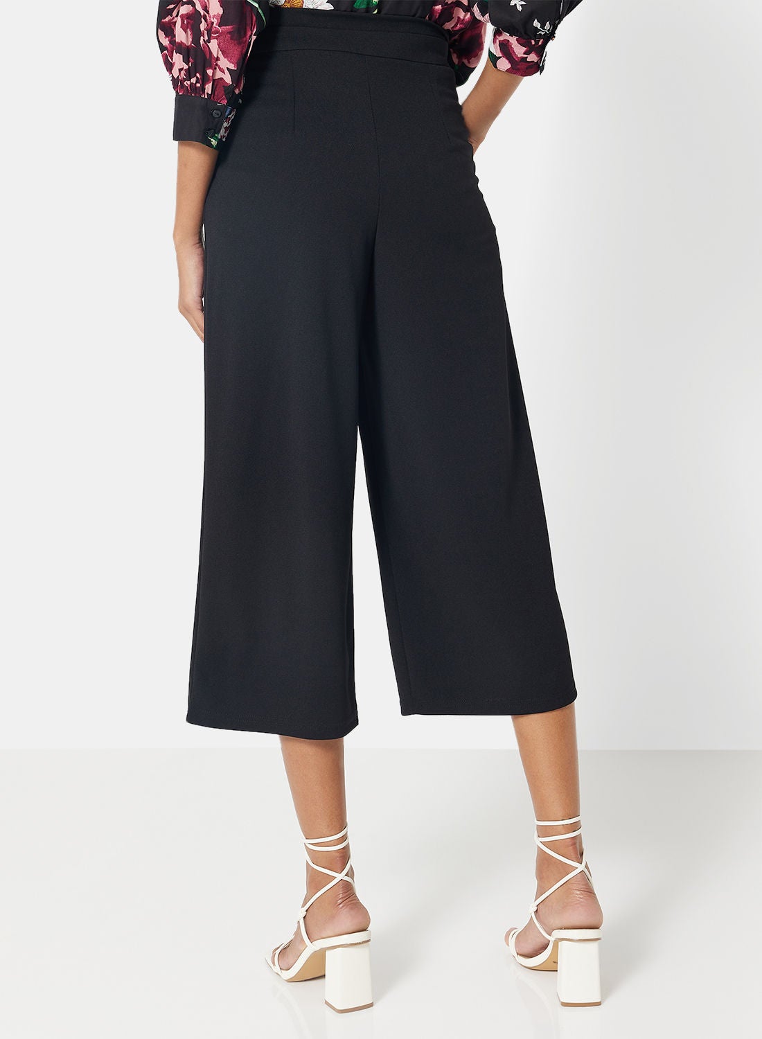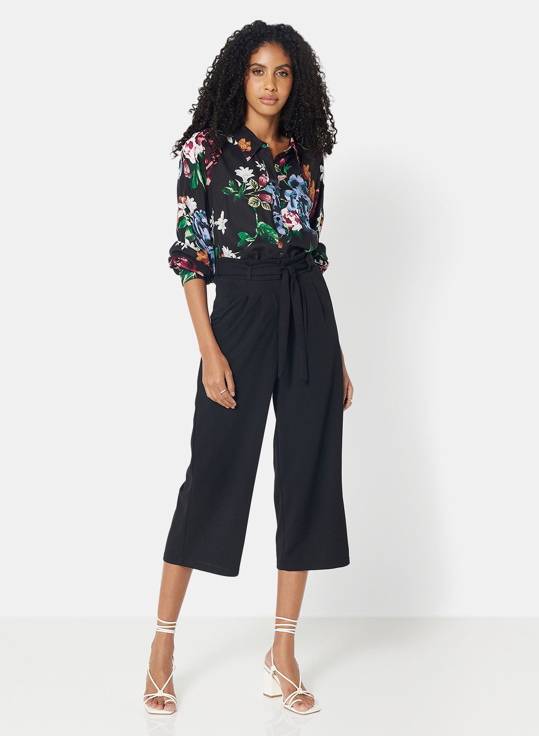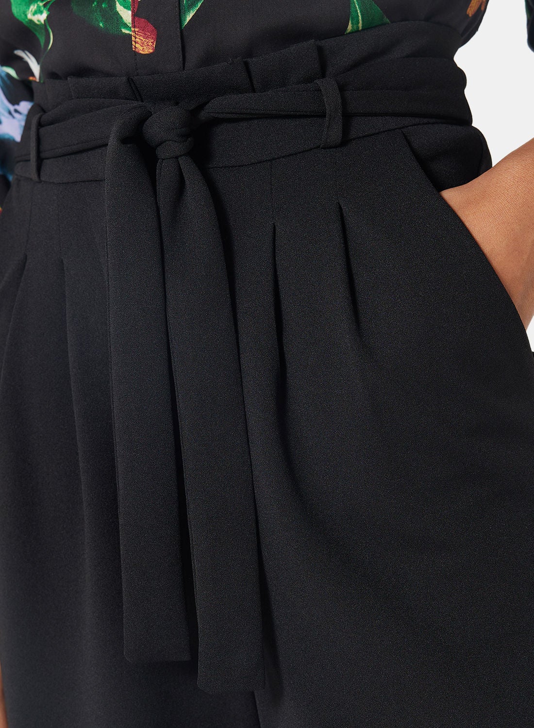 This product features a comfortable and flexible fabric made from a blend of polyester. It includes a hidden zipper fly with a hook top closure and a self-tie waist belt for added style. The fit is straight and the length is cropped. Please follow the care label instructions when washing. The model is approximately 180 cm tall and is wearing a size S.