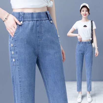 Cropped Tencel Jeans Women’s 2024 Summer New Slimming Elasticated Waist Ice Silk Thin Casual Harlan Straight Pants