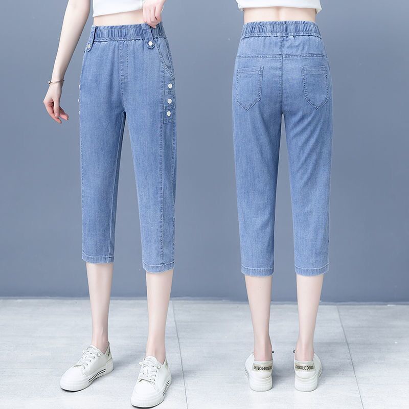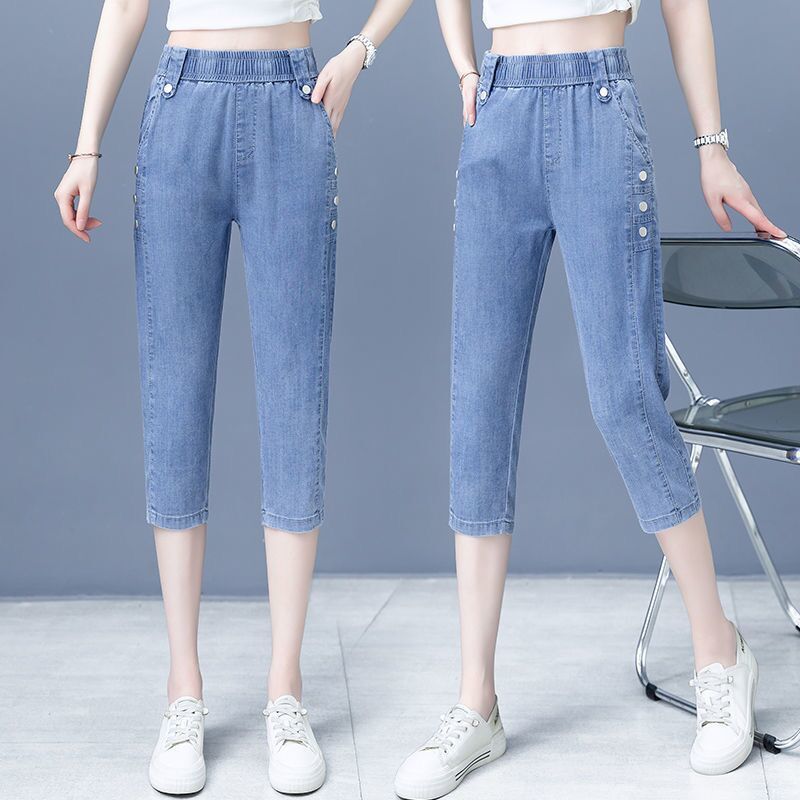 Cropped Tencel Jeans Women's 2024 Summer New Slimming Elasticated Waist Ice Silk Thin Casual Harlan Straight Pants