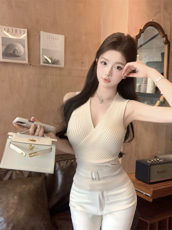 | nameOriginal | Cross apricot v-neck knitted slim sleeveless sling |