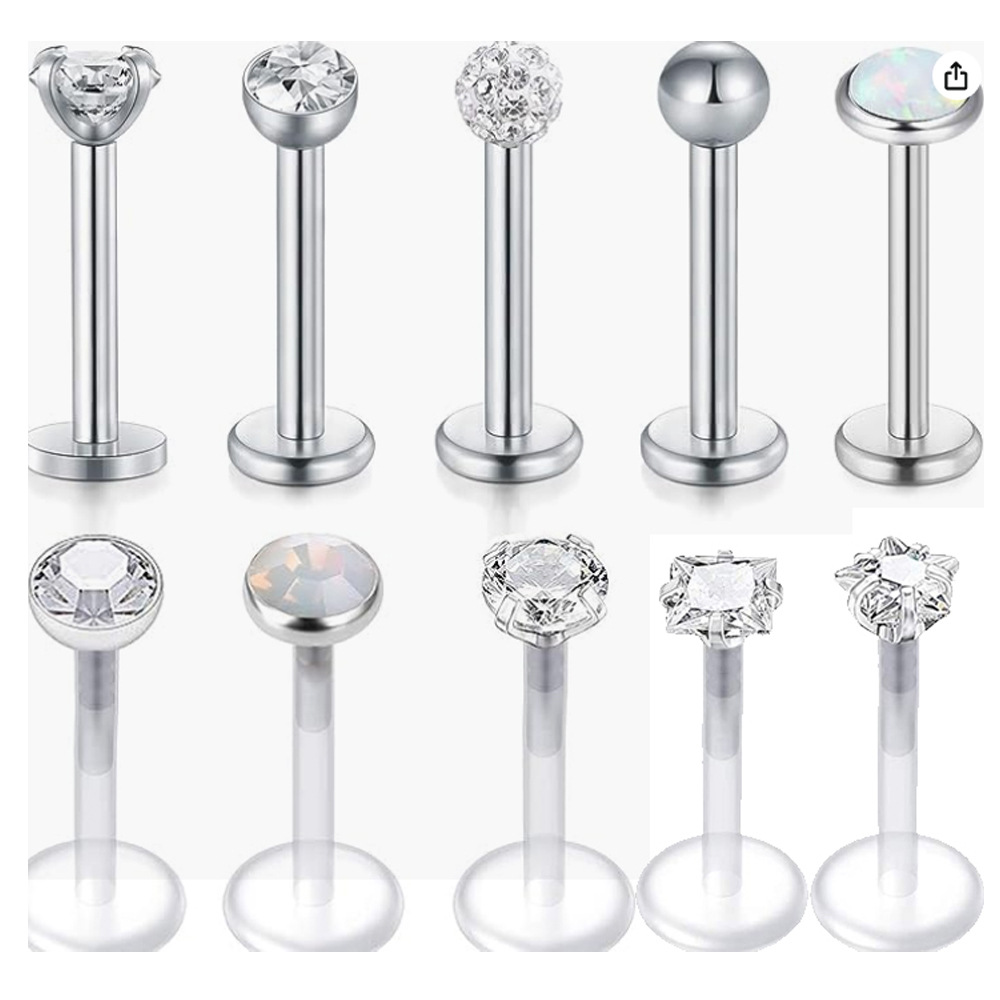 Cross-border 10-piece stainless steel puncture jewelry lip nail acrylic Diamond-embedded zircon opal silver 16G 8mm
