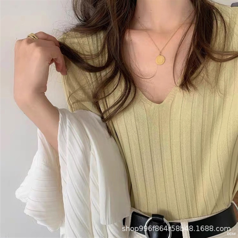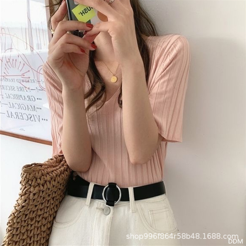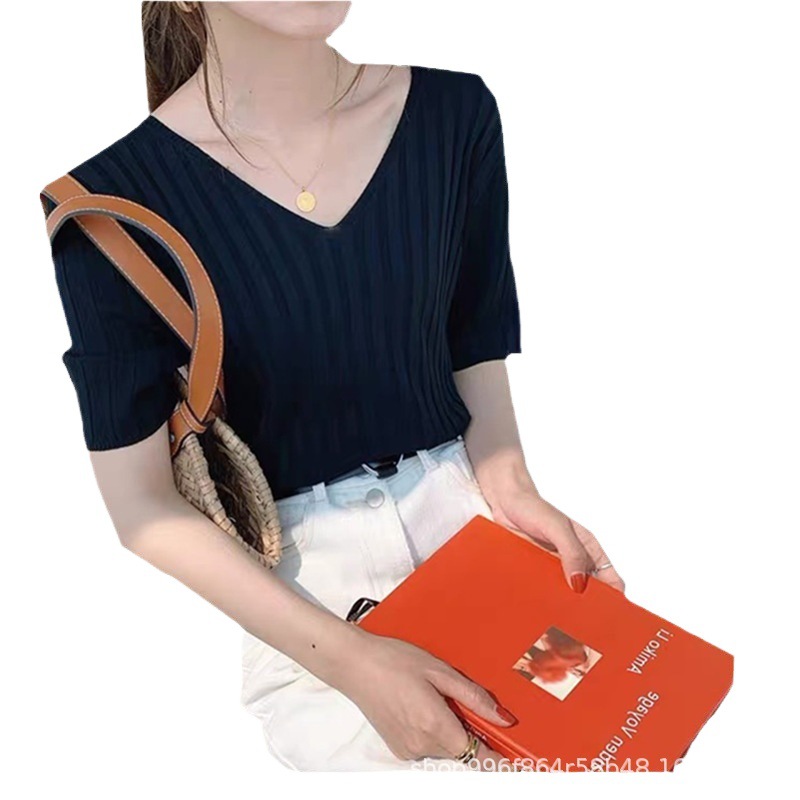 | nameOriginal | Cross-border 2023 new knitwear V-neck short-sleeved T-shirt women's summer curved beads thin bottoming loose fashionable top |