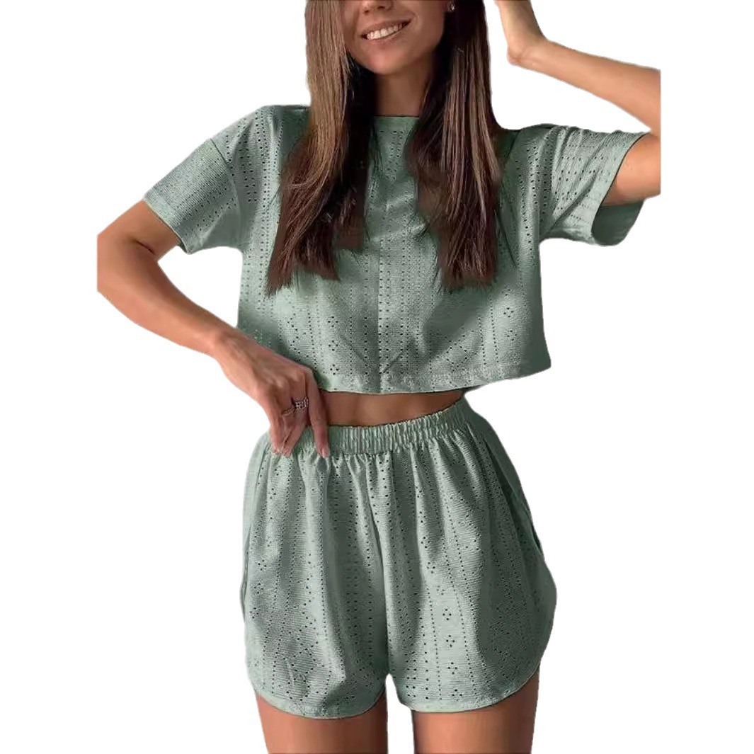 | nameOriginal | Cross-border 2024 Spring and Summer New European and American Sports Leisure suit Women's Solid Color Hollow-out Split Navel Short Two-piece Set |