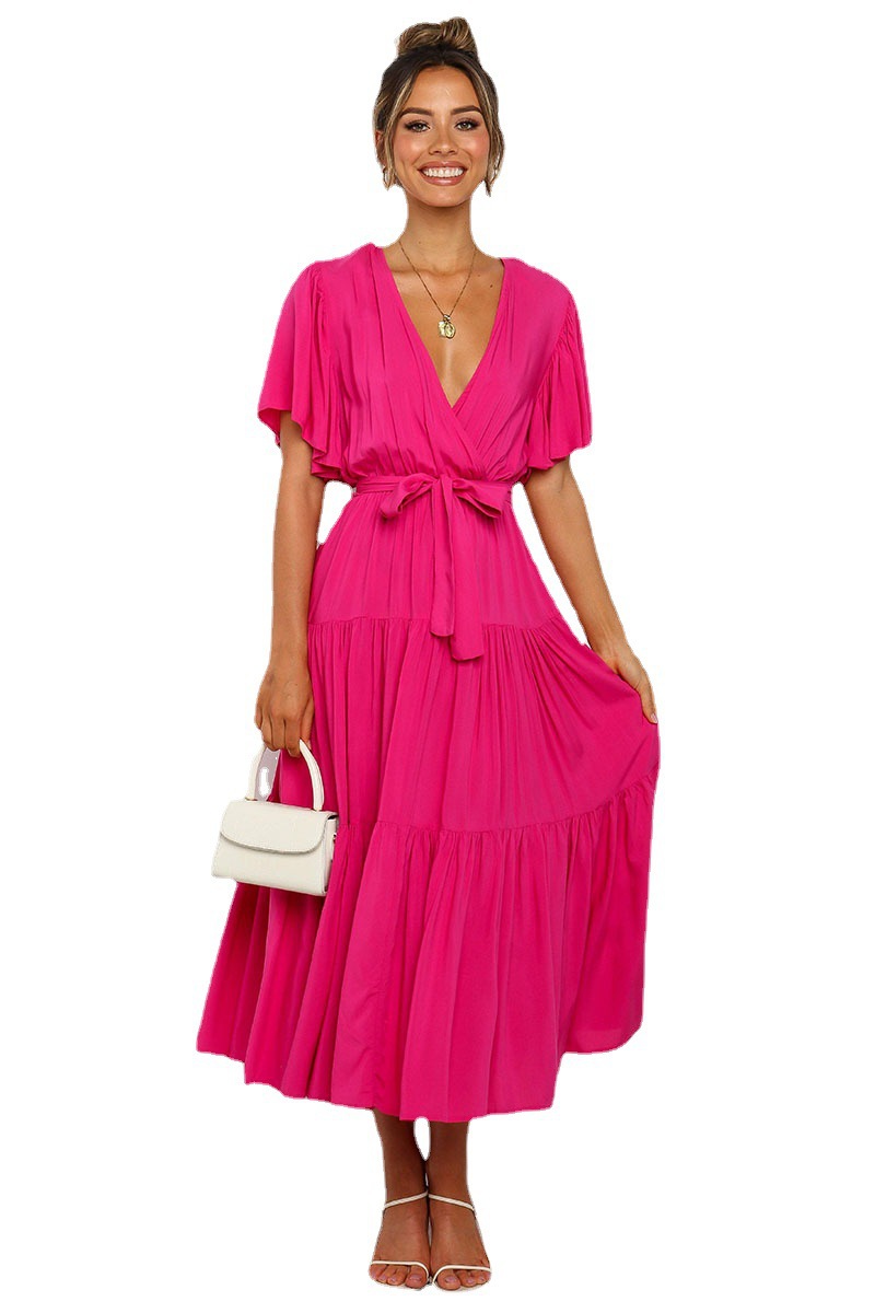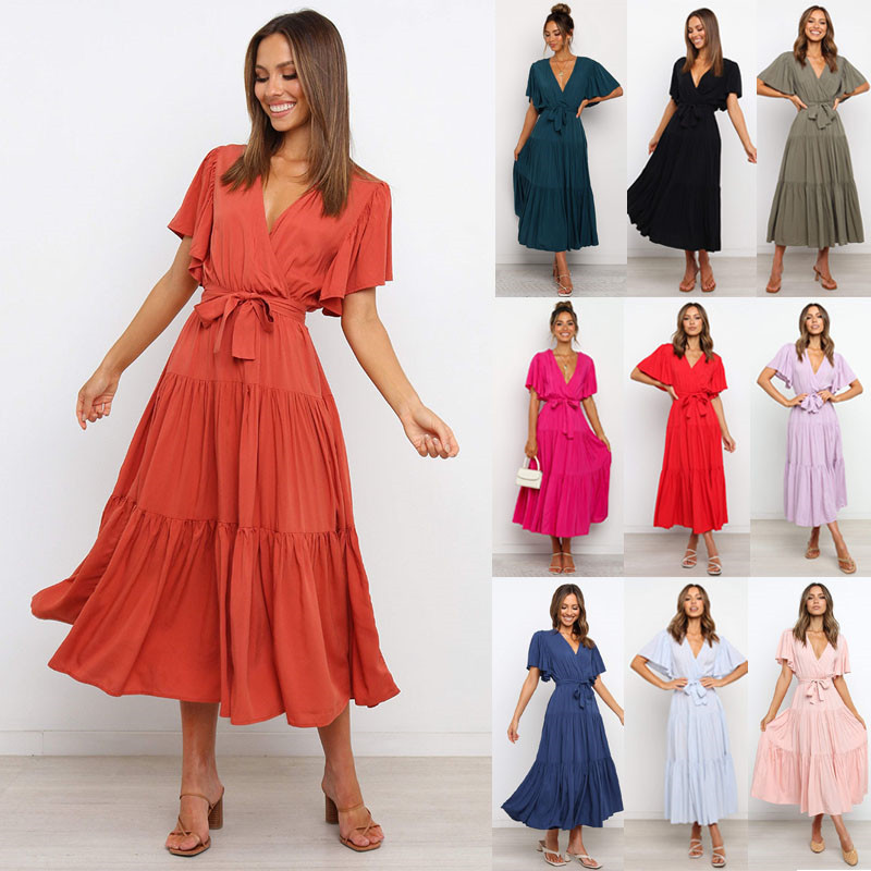 Cross-border Amazon 2023 Summer solid color V-neck short-sleeved dress Bohemian lace-up waist swing dress