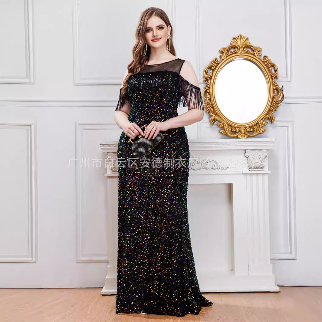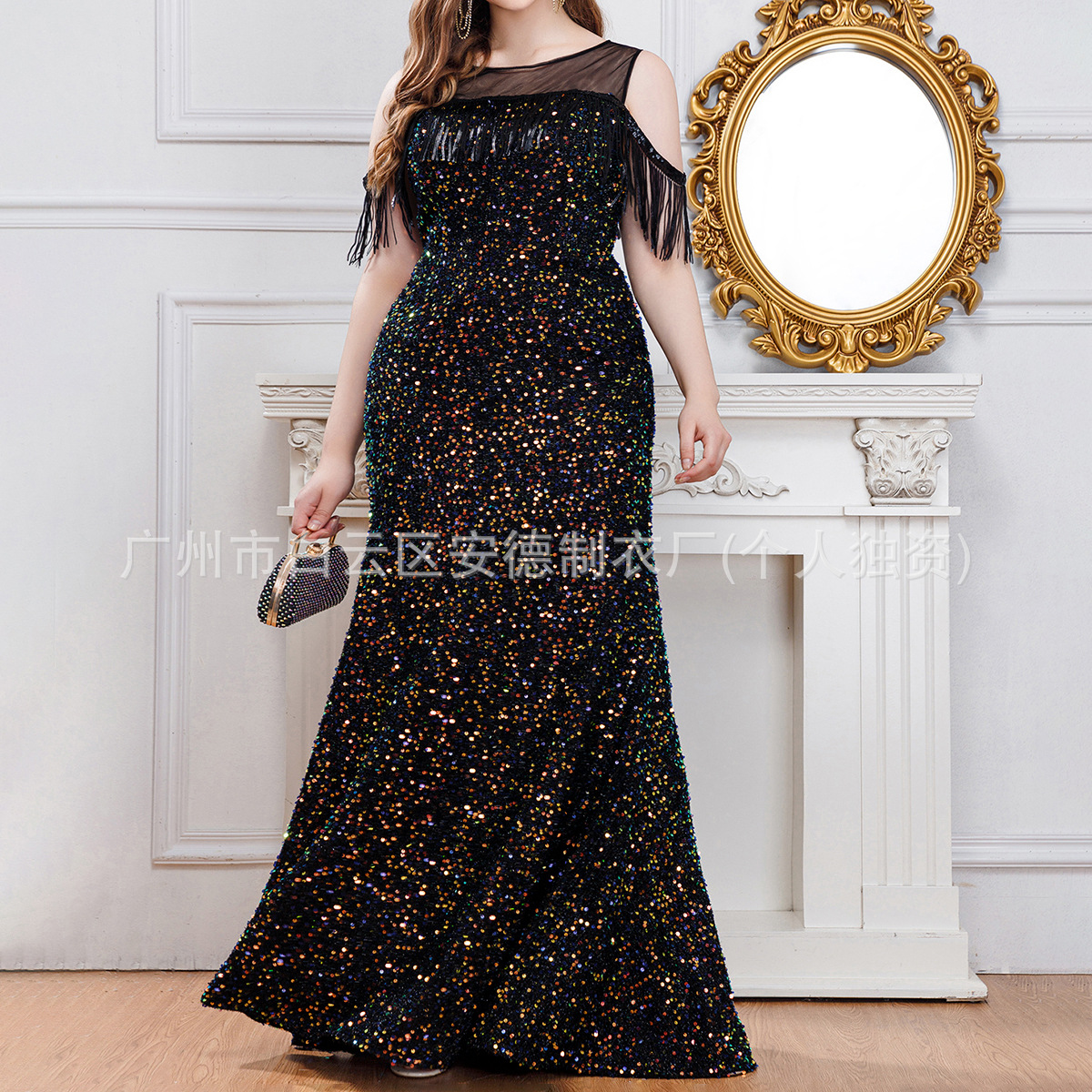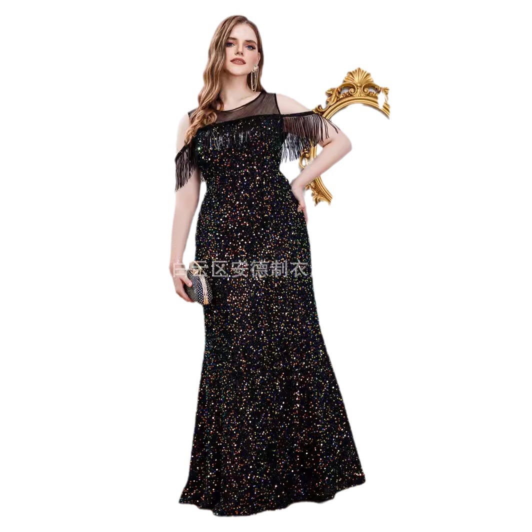 Cross-border Amazon Elegant plus size Long Dress European and American Independent Station Sequin Tassel Fishtail Evening Dress Women’s Foreign Trade