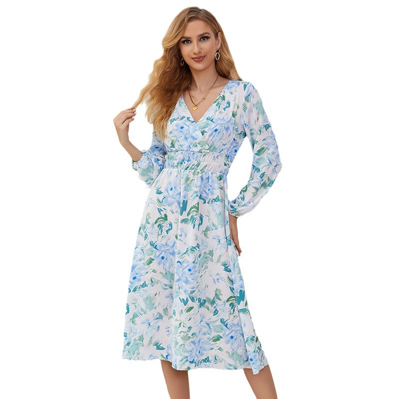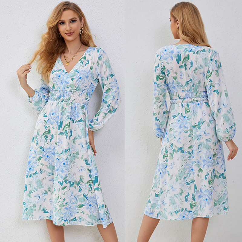 Cross-border Amazon independent station 2023 European and American autumn V-neck elastic waist lantern sleeve chiffon printed dress women