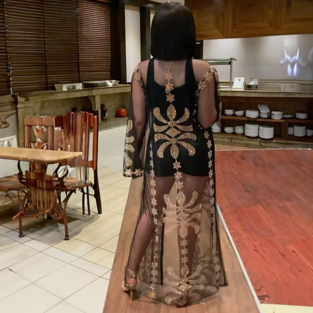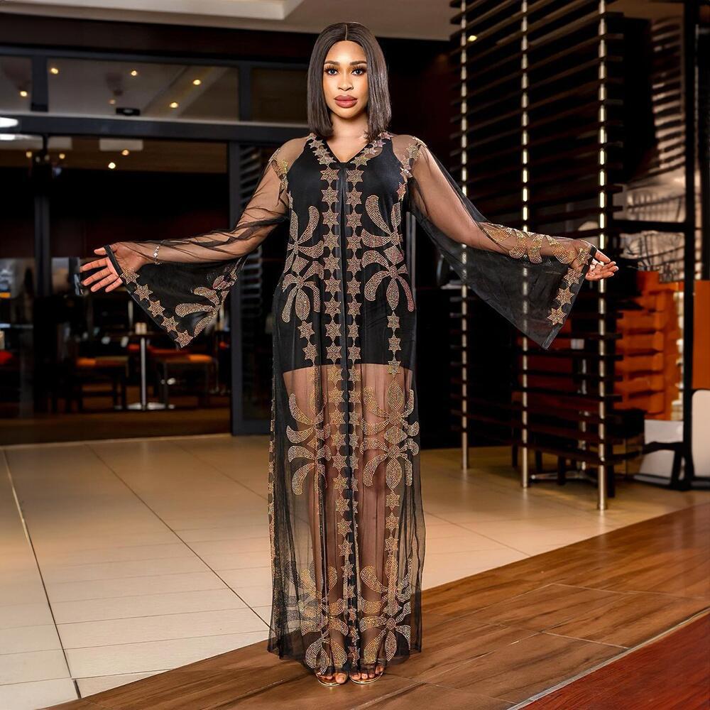 Cross-border e-commerce independent station European, American and African ethnic style robe fashion mesh front and back hot drilling with suspender dress
